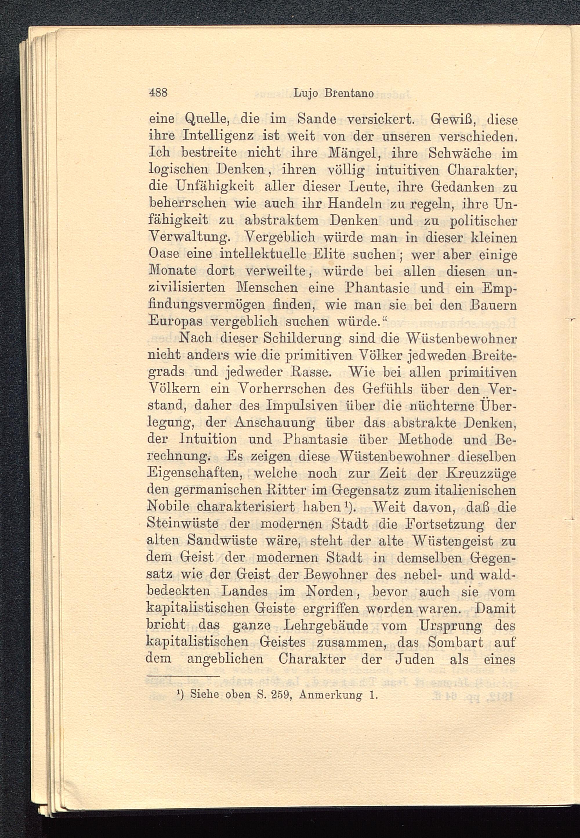 Nach dieser Schilderung sind die Wüstenbewohnernicht anders wie die primitiven V ölker jedweden Breite-grads und jedweder Rasse. Wie bei allen primitivenVölkern ein Vorherrschen des Gefühls über den Ver-stand, daher des Impulsiven über die nüchterne Über-legung, der Anschauung über das abstrakte Denken,der Intuition und Phantasie über Methode und Be-rechnung. Es zeigen diese Wüstenbewohner dieselbenEigenschaften, welche noch zur Zeit der Kreuzzügeden germanischen Ritter im Gegensatz zum italienischenNobile charakterisiert haben 1 ). Weit davon, daß dieSteinwüste der modernen Stadt die Fortsetzung deralten Sandwüste wäre, steht der alte Wüstengeist zudem Geist der modernen Stadt in demselben Gegen-satz wie der Geist der Bewohner des nebel- und wald-bedeckten Landes im Norden, bevor auch sie vomkapitalistischen Geiste ergriffen worden waren. Damitbricht das ganze Lehrgebäude vom Ursprung deskapitalistischen Geistes zusammen, das Sombart aufdem angeblichen Charakter der Juden als eines