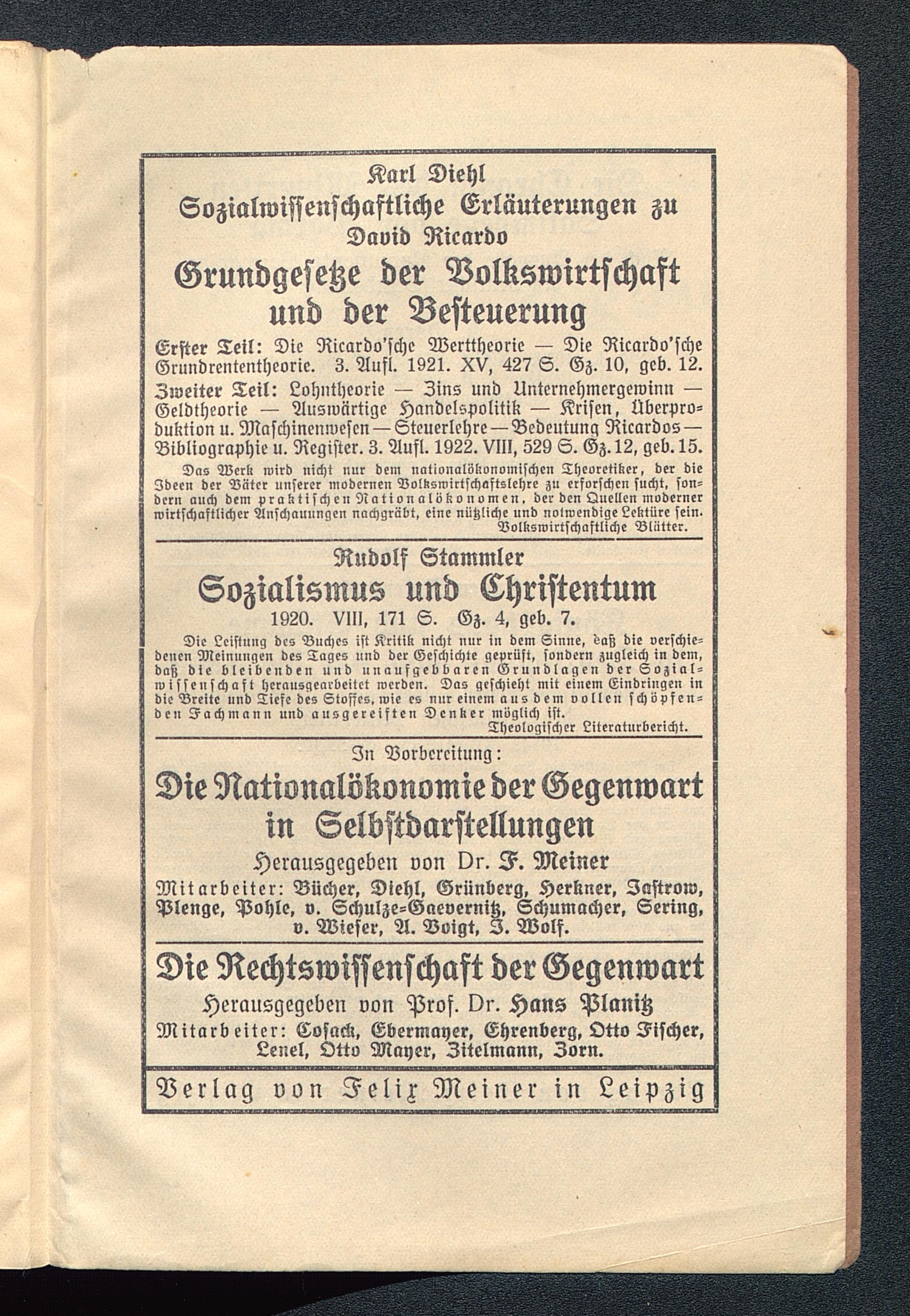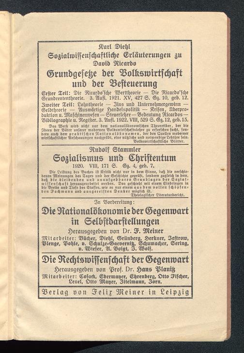 ©rfter Seil: Sie SRicarbo'fdjc 2Bertti)eoric — Sie '•Ricarbo’fdje©runbrententijeoric. 3. 2Iufi. 1921. XV, 427 S. @ 3 . 10, geb. 12.3 ioeiter Seil: Coljiitljeorie — 3ins unb Unternebmergeroinn —©elbtfjeorie — Vusiutirtige ^anbelspolitik — S?rifen, Überpro»buhtion u. üUtafcfjinemuefcn — ©teuerleijre — Vebeutung Vicarbos —23ibliograpl)ie u. Otegijier. 3.2lufl. 1922. VIII, 529 S. © 3 .12, geb. 15.