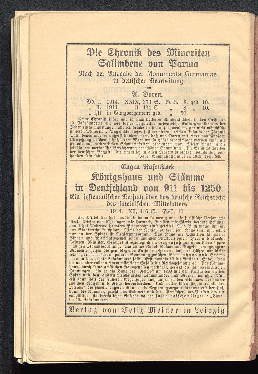 teilte (Ebronib fiifjrt mit jo unmittelbarer 51nfd)aulid)kcit in ben (Seift bes13. 3af)rfjunbert5 ein roie biefcs beifpiellos farbenreiche Äulturgemälbe aus ber5c_ber eines unbefangen alle (Sinbtücke in fid) aufnebmenben, gar nicht mönd)tfd)=finfteren ©ltnoriten. 'Slngefidjts biefes faft oerroirrenb reichen 3nf)alts ber (EbronibSalimbenes roar es äußerft bankensroert, baß uns ©oren mit einer oollftänbigcnÜberfeßung befrijenftt bat, beren ©3ert um fo büber ueranfdjlagt roerben muß, alsfie mit außerordentlichen Sdjroierigfeeiten oerbunben mar. ©iefer Unnb ift bicfeit 3abrcn roertooUftc 'öereidjerung ber fdjöncn Sammlung ,,©ie ©efd)id)tfdjreibcrber beutfdjen 33orgcit'\ bic eigentlid) in allen £cI)rerbibIiotbeben oollftänbig oor»bonben fein füllte. 'Sagr. ©gmnafialfcbulroefcn 1915, Jpcft 5/6.