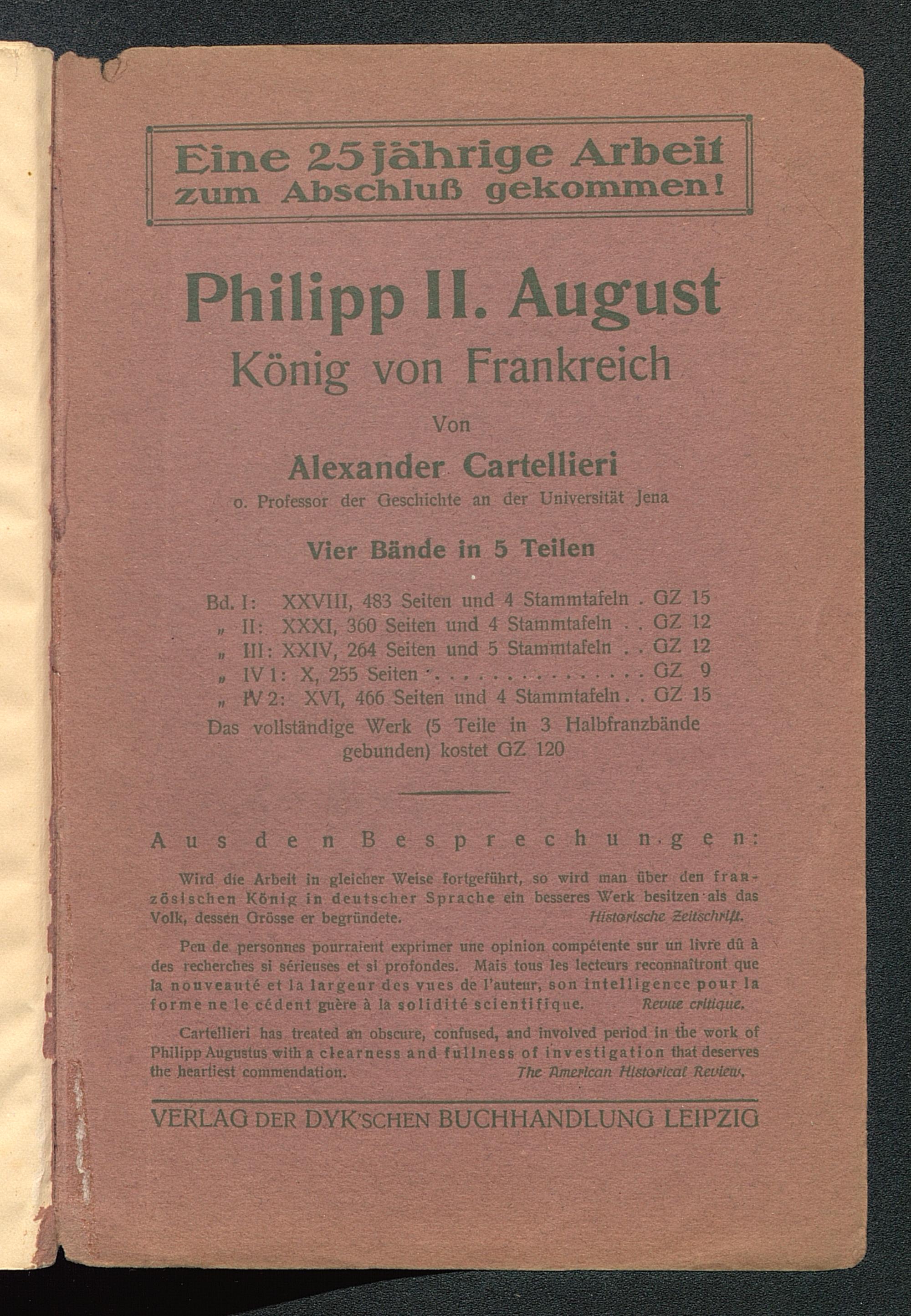 Cartellieri has treated an obscure, confused, and involved period in the work ofPhilippAugustuswitHa clearness and fullness of Investigation thatdeservesthe heartiest commendatioti. The Tlmerlcan Hlstorlcat Review.