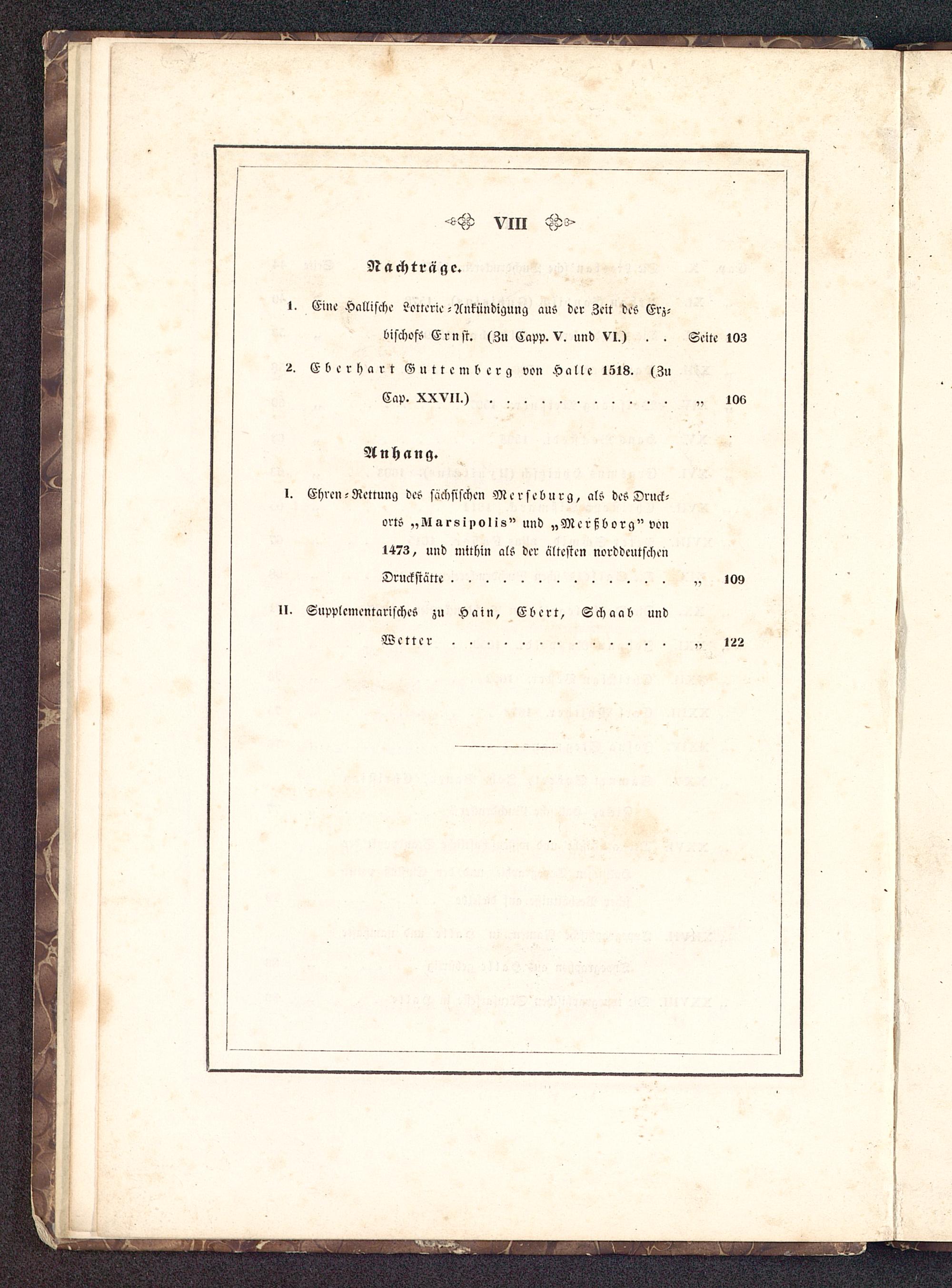I. Ehre» - Rettung des ftchsischen Merseburg, alt- hcS Druck-»rtS „Marsipolis" und „Merßborg" von1473, und niiifni! als der ältesten norddeutschenDruckstättt............. „ 109