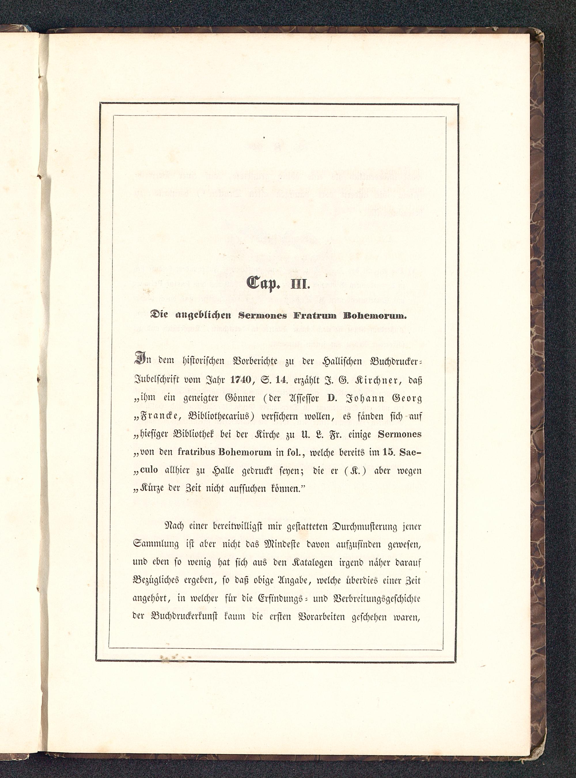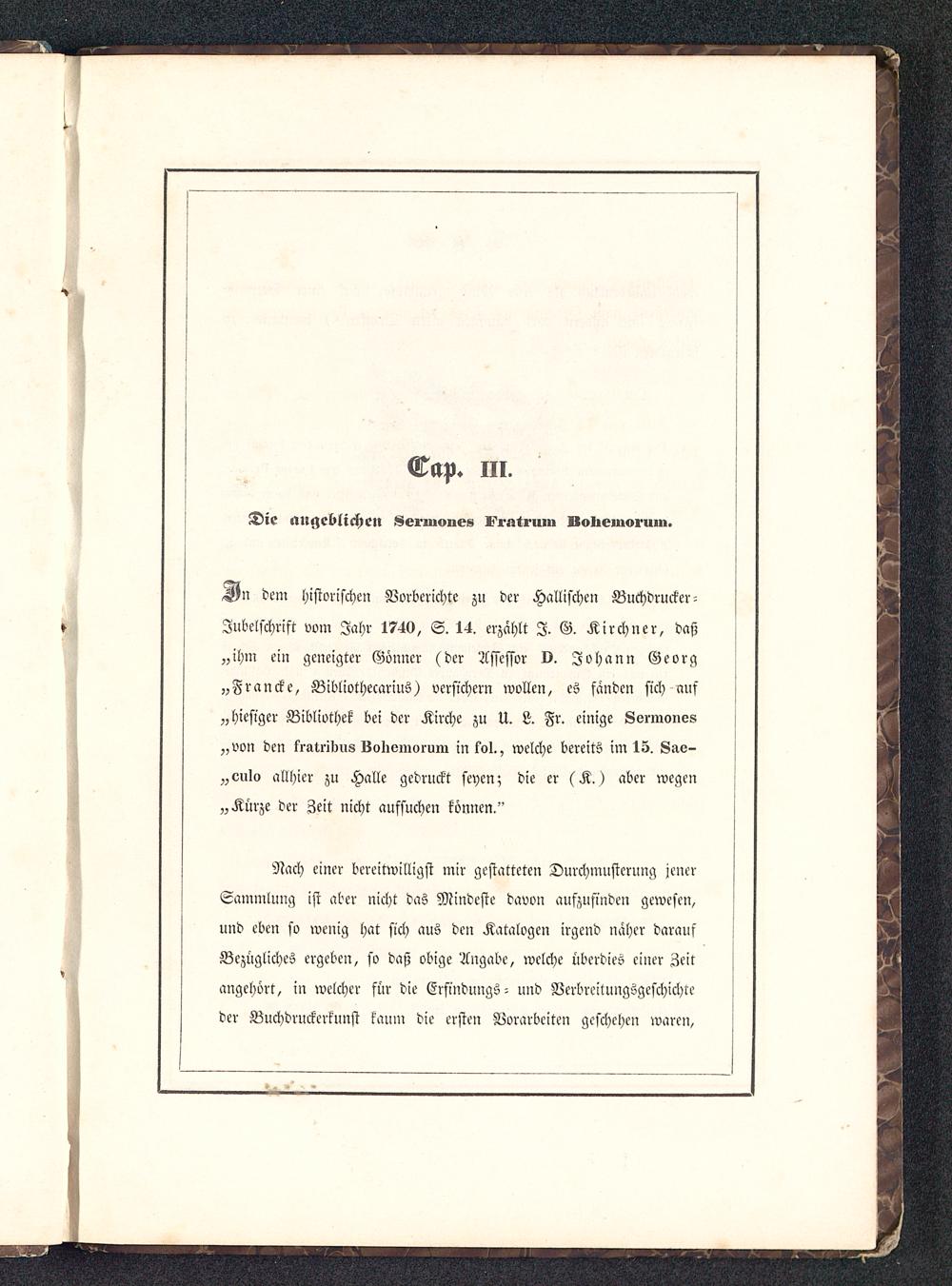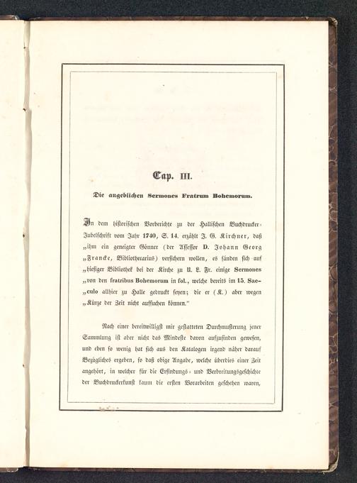 dem historischen Vorberichte zu der Hallischen Buchdrucker-Jubelschrift vom Jahr 1740, S. 14. erzählt I. G. Kirchner, daß„ihm ein geneigter Gönner (der Assessor 0. Johann Georg„Francke, Bibliothecarius) versichern wollen, es fanden sich aus„hiesiger Bibliothek bei der Kirche zu U. L. Fr. einige Sermone«„von den fratribus Bolieniorum in fol., welche bereits im 15. Sae-„culo allhier zu Halle gedruckt seyen; die er (K.) aber wegen„Kürze der Zeit nicht aufsuchen können."