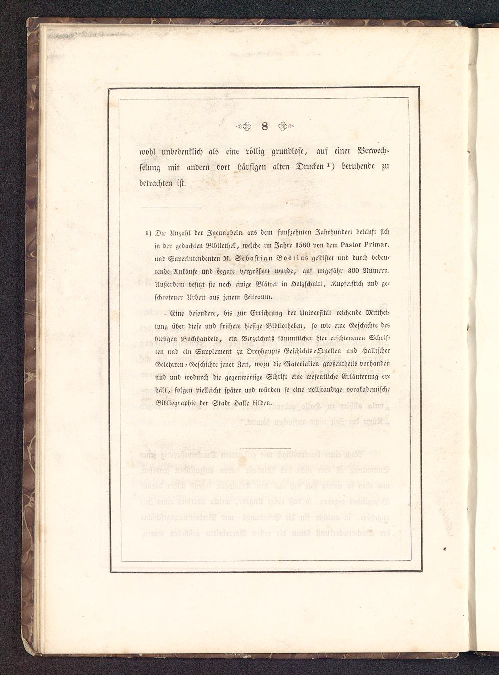 Eine besondere, bis zur Errichtung der Universität reichende Mitthci-lung über diese und frühere hiesige Bibliotheken, so wie eine Geschichte deshiesigen Buchhandels, ein Berzcichniß sämmtlicher hier erschienenen Schrifttcn und ein Supplement zu DreyhauptS GeschichtS-Quellen und HallischerGelehrten - Geschichte jener Zeit, wozu die Materialien großentheilS vorhandensind und wodurch die gegenwärtige Schrift eine wesentliche Erläuterung er-hält, folgen vielleicht später und würden so eine vollständige vorakademischeBibliographie der Stadt Halle bilden.