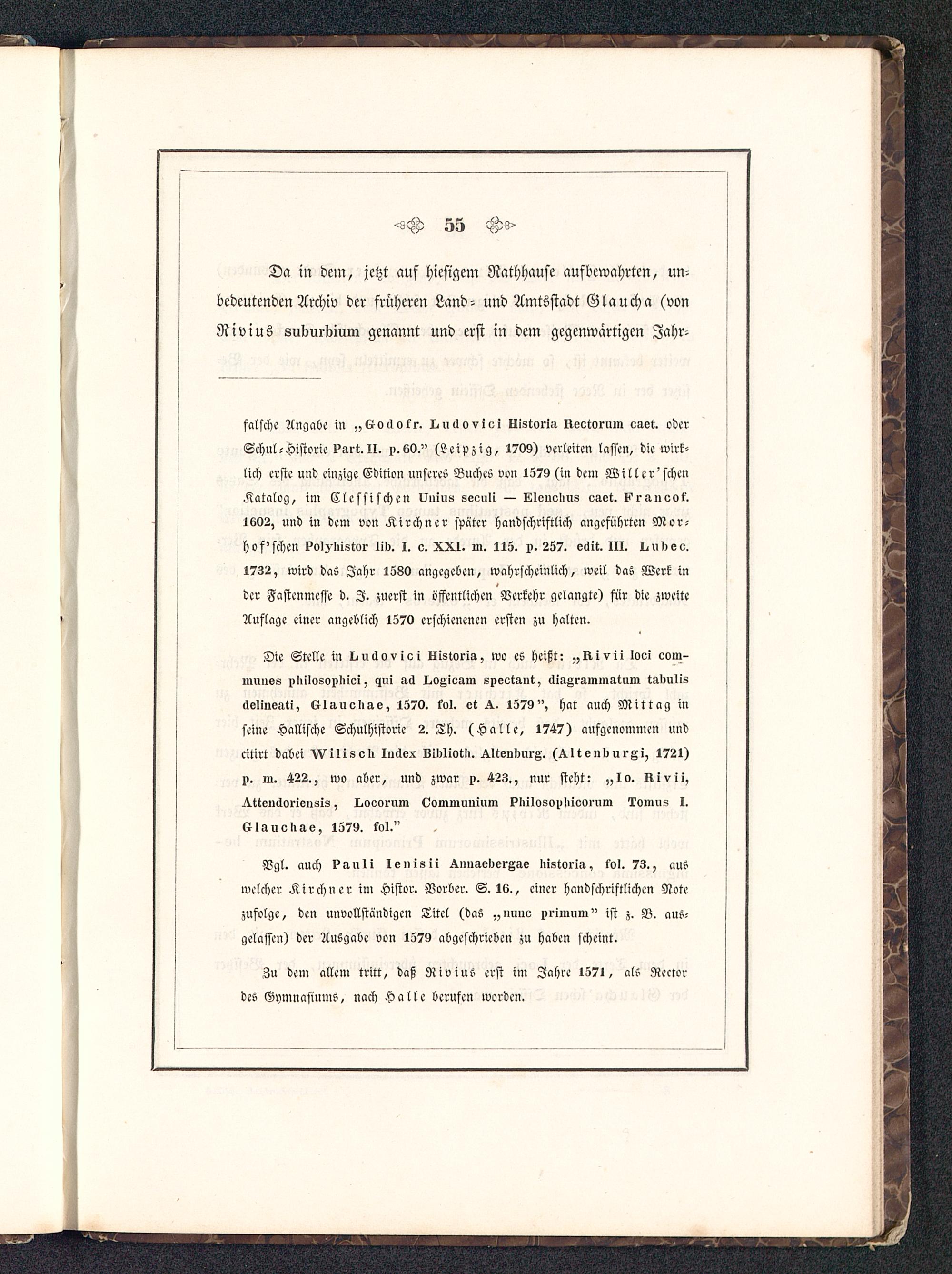Die Stelle in Ludovici Historia, wo eS heißt: „Rivii loci corn-rniiiies philosophici, qui ad Logicarn spectant, iliagrarnmatiim tabnlisdelineati, Glanchae, 1570. fol. et A. 1579", hat auch Mittag inseine Hallifche Schulhistorie 2. Th. (Halle, 1747) aufgenommen undeitirt dabei Wiliscli Index Bibliotli. Altenbnrg. (Altenburgi , 1721)p. in. 422., wo aber, und zwar p. 423., nur steht: „Io. Rivii,Attendorieiisis, Locorurn Cornrnuiiiiim Pliilosopliiconim Tomus I.Glanchae, 1579. fol."