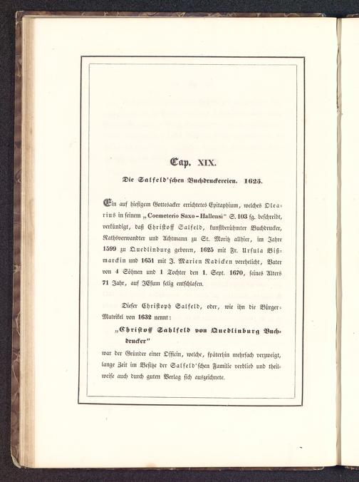 Ein auf hiesigem Gottesacker errichtetes Epitaphium, welches Olea-rius in seinem „ Coemeterio Saxo-IIallensi" S. 103 fg. beschreibt,verkündigt, daß Christoff Salfeld, kunstbcrühmter Buchdrucker,Rathsverwandtcr und Achtmann zu St. Moritz allhicr, im Jahre1599 zu Quedlinburg geboren, 1625 mit Fr. Ursula Biß-marckin und 1651 mit I. Marien Radicken verehelicht, Vatervon 4 Söhnen und 1 Tochter den 1. Sept. 1670, seines Alters71 Jahr, auf JEsum selig entschlafen.
