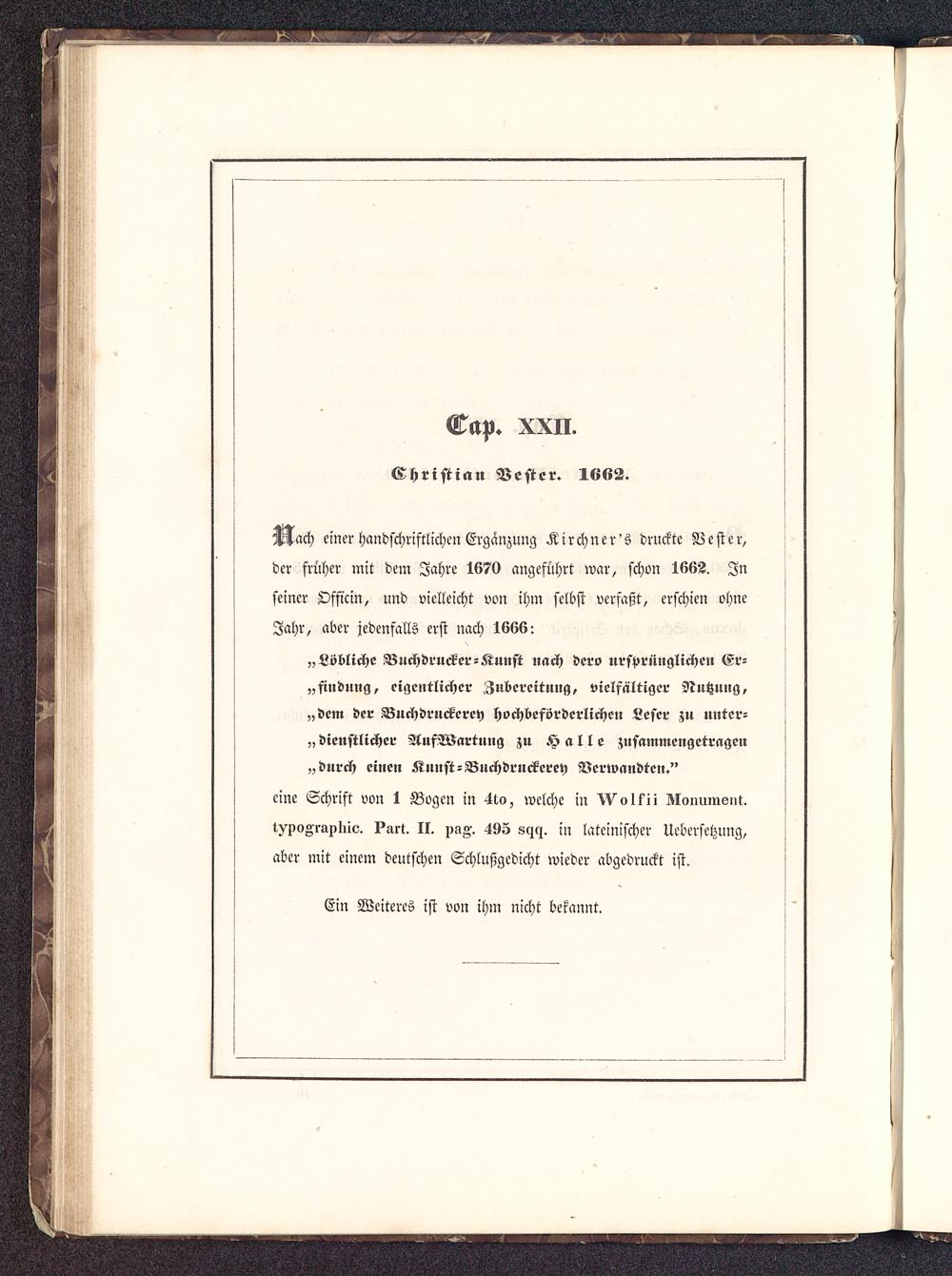 Mach einer handschriftlichen Ergänzung Kirchner's druckte Bester,der früher mit dem Jahre 1670 angeführt war, schon 1662. Inseiner Officin, und vielleicht von ihm selbst verfaßt, erschien ohneJahr, aber jedenfalls erst nach 1666: