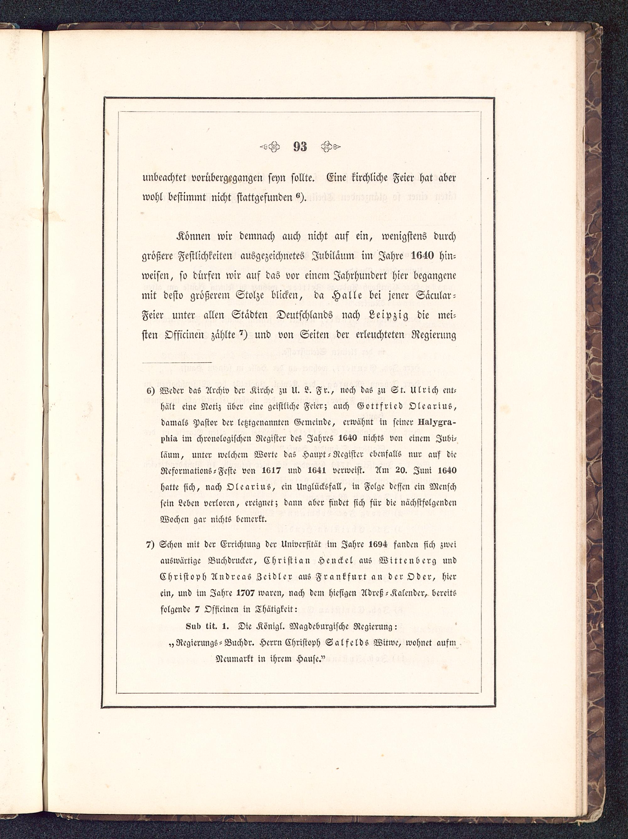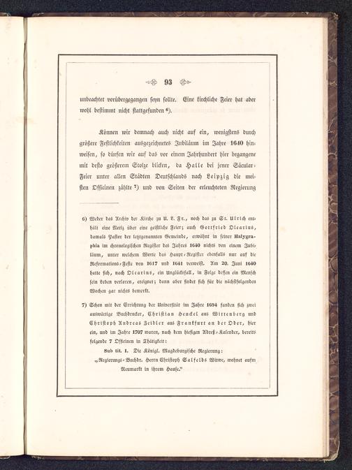 Können wir demnach auch nicht auf ein, wenigstens durchgrößere Festlichkeiten ausgezeichnetes Jubiläum im Jahre 1640 hin-weisen, so dürfen wir auf daS vor einem Jahrhundert hier begangenemit desto größcrem Stolze blicken, da Halle bei jener Säcular-Feier unter allen Städten Deutschlands nach Leipzig die mei-sten Officinen zählte 7 ) und von Seiten der erleuchteten Regierung