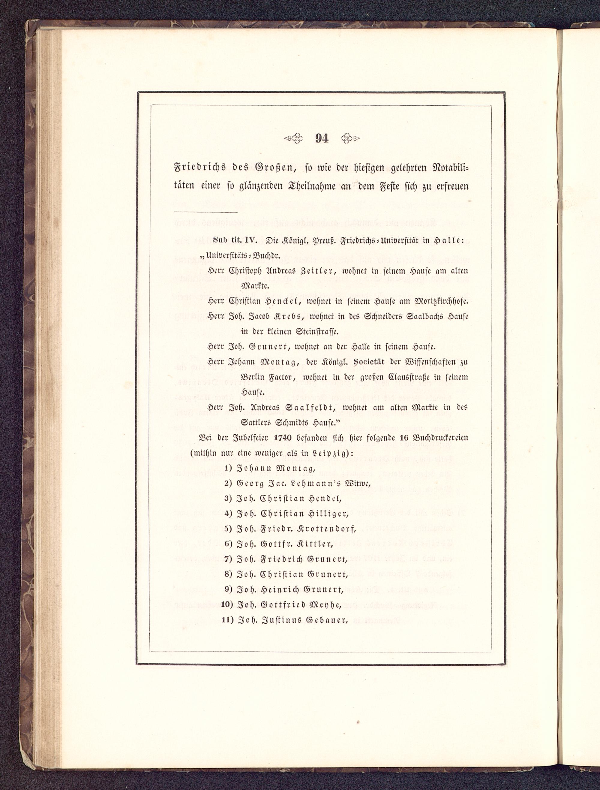 Hab tit. iv. £k Königl, Preuß. Friedrichs - Universität in Hcillc:„UniversitätS-Buchdr.Hcrr Christoph Andreas Zeitler, wohnet in seinem Hause am altenMarkte.