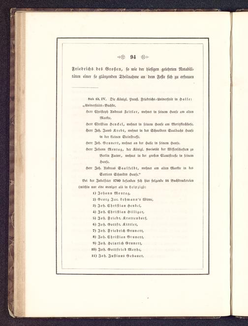 Herr Joh. ?lndreas Saalfeldt, wohnet am alten Markte in desSattlers Schmidts Hause."Bei der Jubelfeier 1740 befanden sich hier folgende 16 Buchdruckereicn(mithin nur eine weniger als in Leipzig) :
