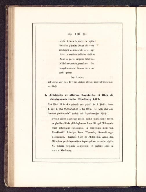 Diuina igitnr annueiite gratia inulta inqnisicione habitaex plnriljus libris philoi'opliorum hunc üb. qui Phisonorniaregia intitulatur collegimiis, in perpetnain rnernoviamExcellentiff. Principis Dom. Wenceslay Secuudi regisBohemornm. Explicit über de Phisonornia Anno dni.Millesimo qtiadringentefimo septuagesimo tercio in vigiüaXI. miliiim virginum Completnin est presens opus inciuitate Merssborg.