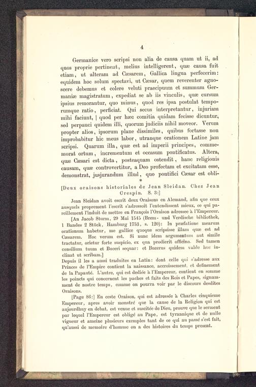 [Page 86:] En ceste Oraison, qui est adresse"e k Charles cinquiemeEmpereur, apres avoir monstre que la cause de la Religion qui estaujourdhuy en debat, est venue et suscitec de Dieu, prouve que le sermentpar lequel l'Empereur est oblige' au Pape, est tyrannique et de nullevigueur et ameine plusieurs exemples tant de ce qui au passe s'cst fait,qu'aussi de memoire d'homme on a des histoires du temps present.