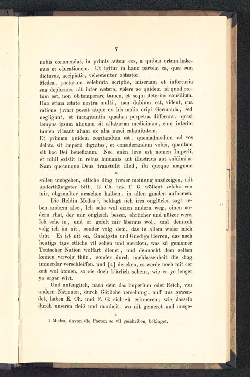 Die Heldin Medea \ beklagt sich ires onglücks, sagt ne-ben anderm also, Ich sehe wol einen andern weg, einen an-dern rhat, der mir ongleich besser, ehrlicher und nützer were,Ich sehe in, und er gefeit mir überaus wol, und dennochvolg ich im nit, sonder volg dem, das in allem wider michthüt. Es ist nit on, Gnedigste und Gnedige Herren, das auchheutigs tags etliche vil sehen und mercken, was zu gemeinerTeutscher Nation wolfart dienet, und dennocht dem selbenkeinen vervolg thün, sonder durch nachlassenheit die dingimmerdar verschleiffen, und [4] dencken, es werde noch mit derzeit wol komen, so sie doch klärlich sehent, wie es ye lengerye erger wirt.