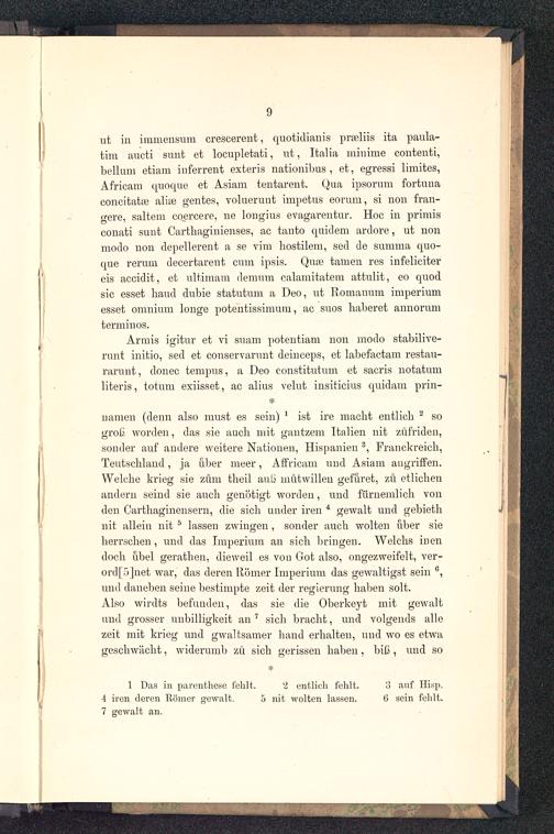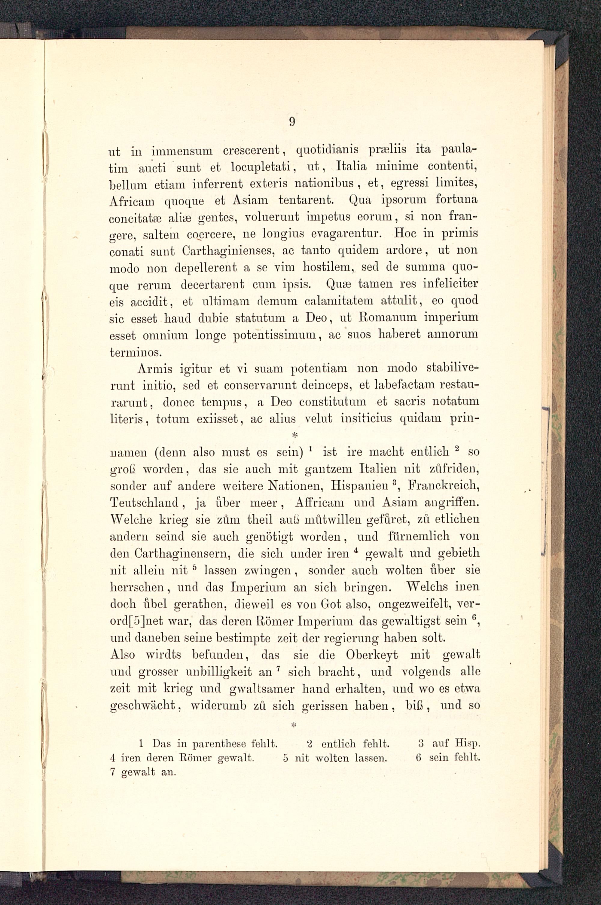 namen (denn also must es sein) 1 ist ire macht entlich 2 sogroß worden, das sie auch mit gautzem Italien nit züfriden,sonder auf andere weitere Nationen, Hispanieu 3 , Franckreicb,Teutschland, ja über meer, Affricam und Asiam angriffen.Welche krieg sie zum theil au(i niütwilleu gefuret, zu etlichenandern seine! sie auch genötigt worden, und fürnemlich vonden Carthaginensern, die sich under iren 4 gewalt und gebiethnit allein nit 0 lassen zwingen, sonder auch wolten über sieherrschen, und das Imperium an sich bringen. Weichs inendoch ftbel gerathen, dieweil es von Got also, ongezweifelt, ver-ord[5]net war, das deren Römer Imperium das gewaltigst sein G ,und daneben seine bestimpte zeit der regierung haben solt.Also wirdts befunden, das sie die Oberkeyt mit gewaltund grosser Unbilligkeit an 7 sich bracht, und volgends allezeit mit krieg und gwaltsamer band erhalten, und wo es etwageschwächt, widerumb zu sich gerissen haben, biß, und so