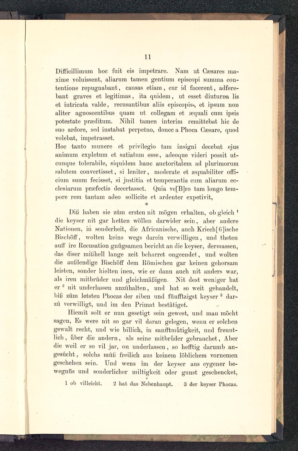 Diß haben sie zum ersten nit mögen erhalten, obgleich 1die keyser nit gar betten wollen darwider sein, aber andereNationen, in Sonderheit, die Africanische, auch Kriech[6]ischeBiscliöff, wolten Iceins wegs darein verwilligen, und tbetenauff ire Recusation gnügsamen beriebt an die keyser, dermassen,das diser mißhell lauge zeit beharret ongeendet, und woltendie außlendige Biscliöff dem Römischen gar keinen gehorsamleisten, sonder Iiielton inen, wie er dann auch nit anders war,als iren mitbrüder und gleichmäßigen. Nit dest weniger hater 2 nit underlassen anzuhalten, und hat so weit gehandelt,biß zürn letsten Phocas der sihen und füufftzigst keyser 3 dar-zfi verwilligt, und im den Primat bestätiget.