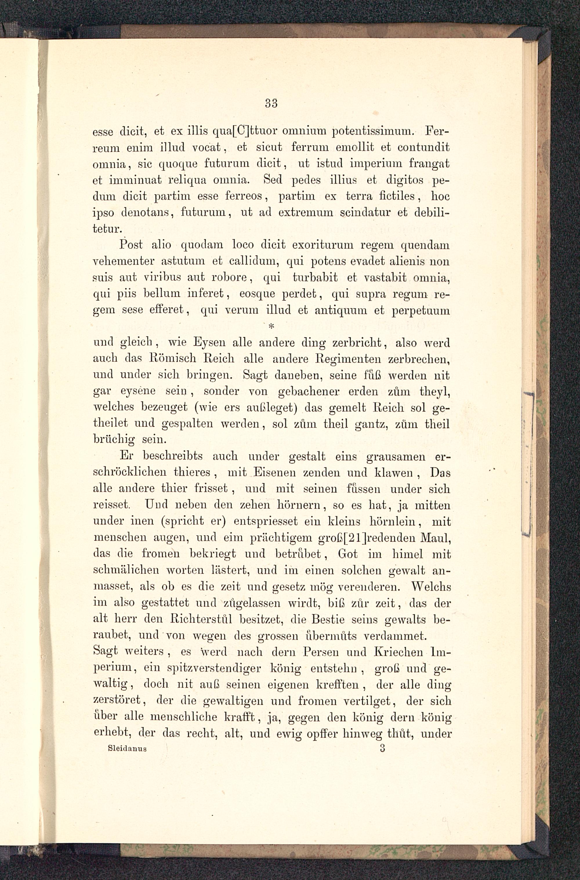 Er beschreibts auch under gestalt eins grausamen er-schröcklichen thieres , mit Eisenen zenden und klawen , Dasalle andere thier frisset, und mit seinen fiissen under sichreisset. Und neben den zehen hörnern, so es hat, ja mittenunder inen (spricht er) entspriesset ein kleins hörnlein, mitmenschen äugen, und eim prächtigem groß[21]redeuden Maul,das die fronten bekriegt und betrübet, Got im himel mitschmälichen Worten lästert, und im einen solchen gewalt an-masset, als ob es die zeit und gesetz mög verenderen. Weichs im also gestattet und zugelassen wirdt, biß zur zeit, das deralt herr den Richterstül besitzet, die Bestie seius gewalts be-raubet, und von wegen des grossen Übermuts verdammet.Sagt weiters , es werd nach dern Persen und Kriechen Im-perium, ein spitzverstendiger könig entstehn , groß und ge-waltig , doch nit auß seinen eigenen krefften , der alle dingzerstöret, der die gewaltigen und fronten vertilget, der sichüber alle menschliche krafft, ja, gegen den könig dern königerhebt, der das recht, alt, und ewig opffer hinweg thut, under