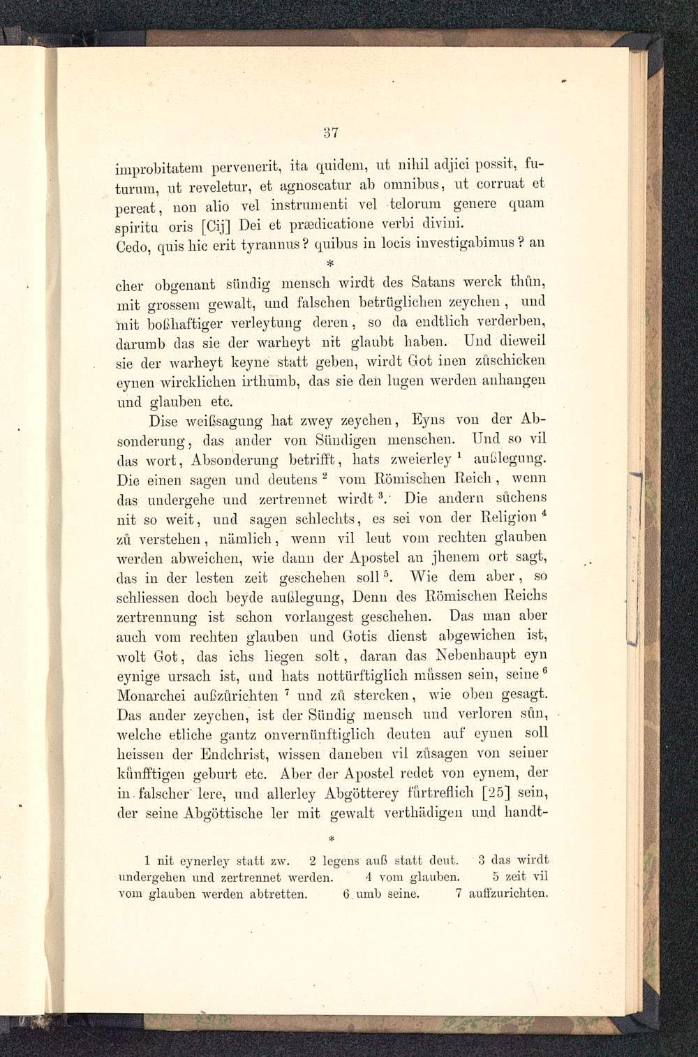 Dise weißsagung hat zwey zeychen, Eyns von der Ab-sonderung, das ander von Sündigen menschen. Und so vildas vvort, Absonderung betrifft, hats zweierley 1 au Biegung.Die einen sagen und deutens 2 vom Komischen Reich, wenndas undergehe und zertrennet wirdt V Die andern süchensnit so weit, und sagen schlechts, es sei von der Religion 1zu verstehen, nämlich, weuu vil leut vom rechten glaubenwerden abweichen, wie dann der Apostel an jhenem ort sagt,das in der lesten zeit geschehen soll 5 . Wie dem aber, soschliessen doch beyde außlegung, Denn des Römischen Reichszertrennung ist schon vorlangest geschehen. Das man aberauch vom rechten glauben und Gotis dienst abgewichen ist,wolt Got, das ichs liegen solt, daran das Nebenhaupt eyneynige ursach ist, und hats nottürftiglich müssen sein, seine GMonarchei auszurichten 7 und zu stercken, wie oben gesagt.Das ander zeychen, ist der Sündig mensch und verloren sün,welche etliche gautz onvernünftiglich deuten auf eynen sollheissen der Endchrist, wissen daneben vil zusagen von seiuerkünfftigen geburt etc. Aber der Apostel redet von eynem, derin. falscher'lere, und allerley Abgötterey f'ürtreflich [25] sein,der seine Abgöttische 1er mit gewalt verthädigen und handt-