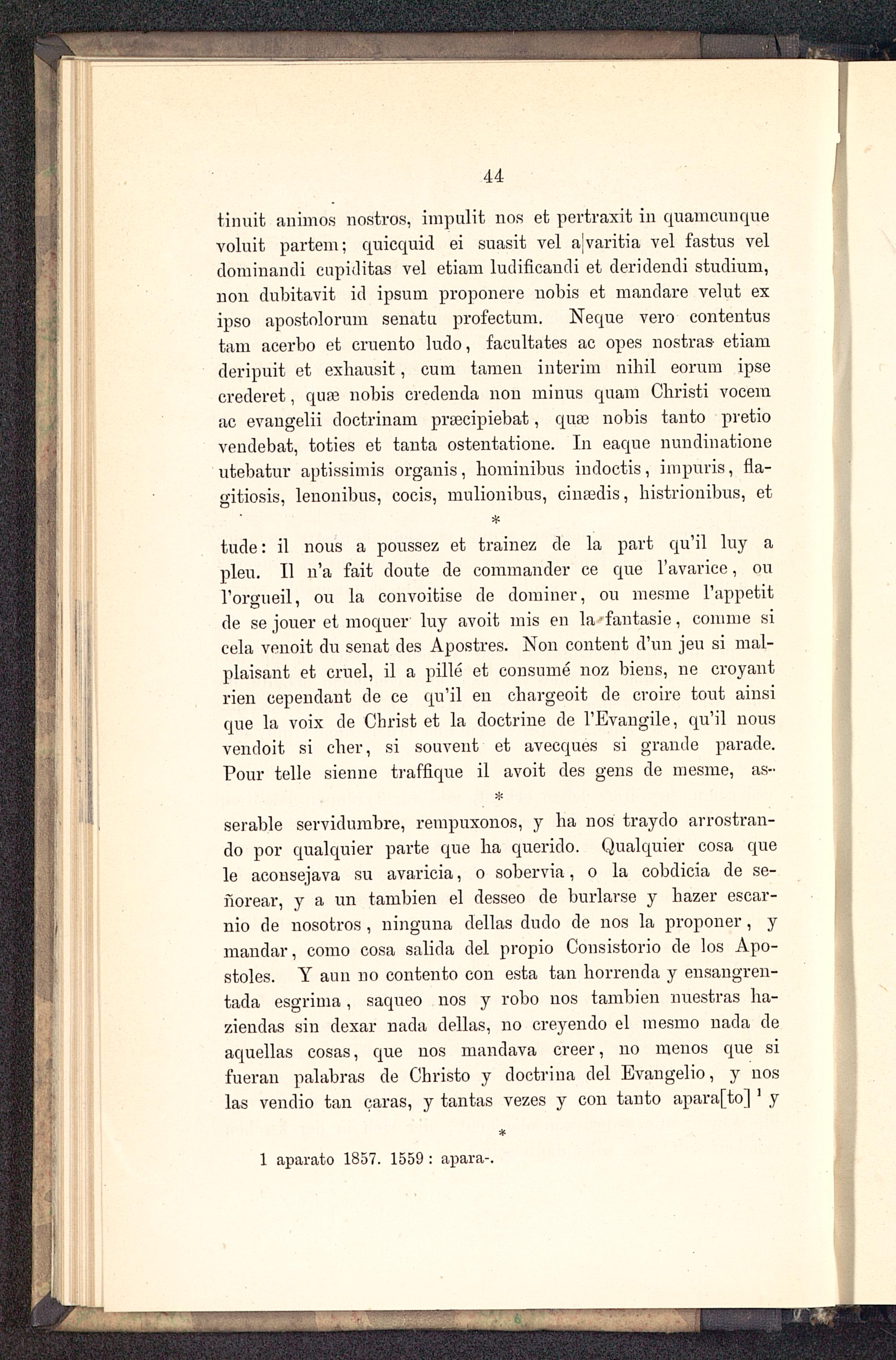 serable servidumbre, rempuxonos, y ha nos traydo arrostran-do por qualqnier parte que ha querido. Qualquier cosa quele aconsejava su avaricia, o sobervia, o la cobdicia de se-norear, y a un tambien el desseo de burlarse y hazer escar-nio de nosotros , ninguna dellas dudo de nos la proponer, ymandar, como cosa salirla del propio Consistorio de los Apo-stoles. Y aun no contento con esta tan horreuda y ensangren-tada esgrima, saqueo nos y robo nos tambien nuestras ha-ziendas sin dexar nada dellas, no creyendo el mesmo nada deaquellas cosas, que nos mandava creer, no menos que sifueran palabras de Christo y doctrina del Evangelio, y noslas vendio tan caras, y tantas vezes y con tanto apara[to] 1 y