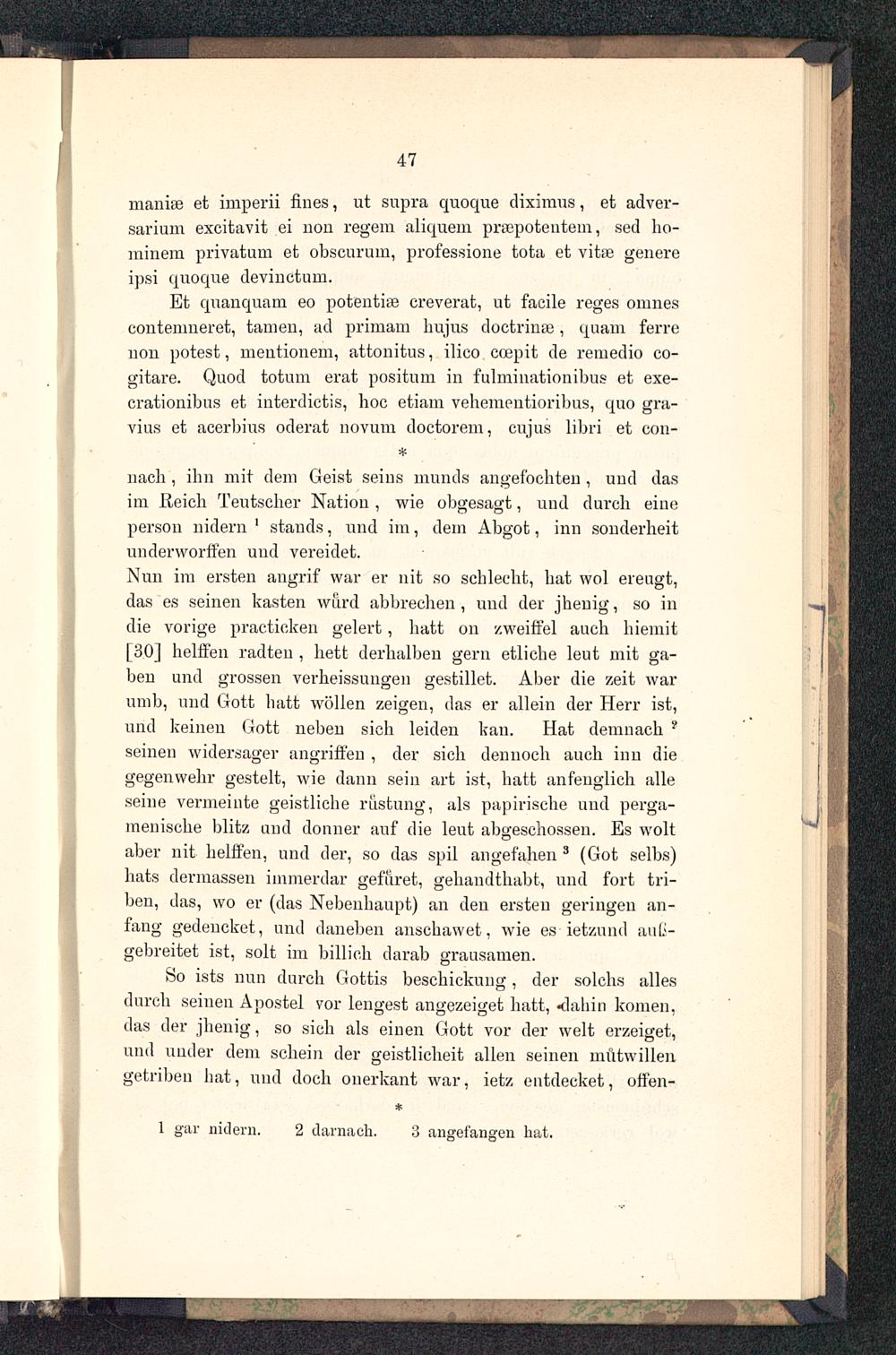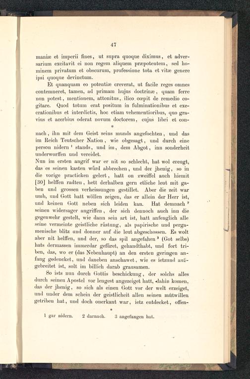 Nun im ersten angrif war er nit so schlecht, hat wol ereugt,das es seinen kästen ward abbrechen , und der jheuig, so indie vorige practicken gelert, hatt ou zweiffei auch hiemit[30] helffen radten , hett derhalben gern etliche leut mit ga-ben und grossen verheissungen gestillet. Aber die zeit warumb, und Gott hatt wollen zeigen, das er allein der Herr ist,und keinen Gott neben sich leiden kau. Hat demnach ■seinen widersager angriffen , der sich dennoch auch inn diegegenwehr gestelt, wie dann sein art ist, hatt anfenglich alleseine venneinte geistliche rastung, als papirische und perga-menische blitz und donuer auf die leut abgeschossen. Es woltaber nit helffen, und der, so das spil angefallen 3 (Got selbs)hats dermassen immerdar gefüret, gehandthabt, und fort tri-ben, das, wo er (das Nebenhaupt) an den ersten geringen an-fang gedencket, und daneben anschawet, wie es ietzund aus-gebreitet ist, solt im billich dar ab grausamen.