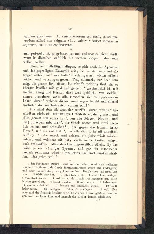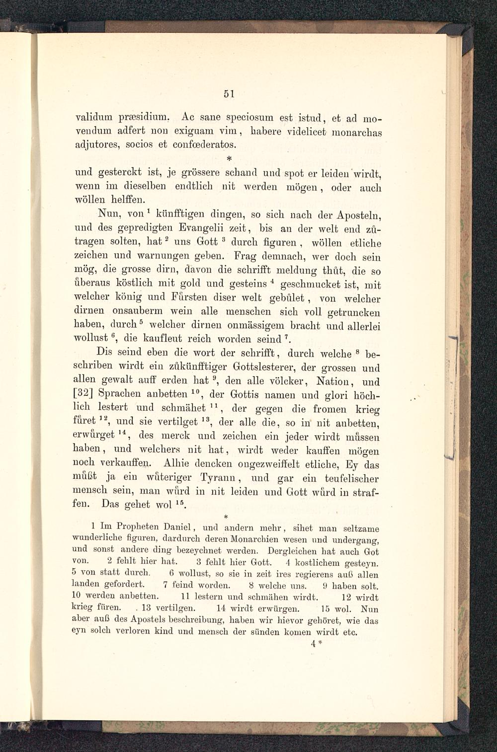 Dis seiud eben die wort der schrifft, durch welche 8 be-schriben wirdt ein zukünftiger Gottslesterer, der grossen undallen gewalt auff erden hat 9 , den alle völcker, Nation, und[32] Sprachen anbetten 10 , der Gottis uameu und glori höch-lich lestert und schmähet 11 , der gegen die fromen krieg
