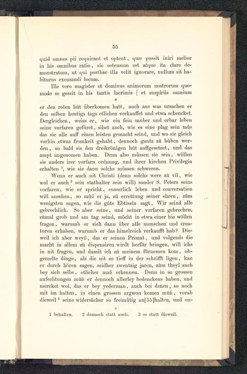 Wenn er auch nit Christi (denn solchs were zu vil, wiewol er auch 2 sein stathalter sein will) sonder S. Peters seinsvorfaren, wie er spricht, eusserlich leben und conversationwill ansehen, so muß er ja, zu errettuug seiner ehren, zumwenigsten sagen, wie die gute Ebtissin sagt, Wir seind allegebrechlich. So aber seine, und seiner vorfaren gebrechen,zumal grob und am tag seind, möcht in etwa einer hie wollenfragen, warumb er sich dann über alle menschen und crea-turen erhaben, warumb er das himelreicb verkaufft hab? Die-weil ich aber weyß, das er seinen Primat, und volgends diemacht in allem zu dispensiren wirdt herfür bringen, will ichsin nit fragen, und damit ich zu meinem fürnemen kom, ob-genielte dinge, als die nit so tieff in der schrifft ligen, kauer durch hören sagen, seidher Zwentzig jaren, zum theyl auchbey sich selbs, etlicher maß erkennen. Denn in so grossenaufechtuugen muß er dennoch allerley bedenckens haben, undmercket wol, das er bey yederman, auch bei denen, so nochmit im halten, in einen grossen argwon komeu muß , vorabdieweil 3 seine widersächer so freimütig an[o5]halton, und on-