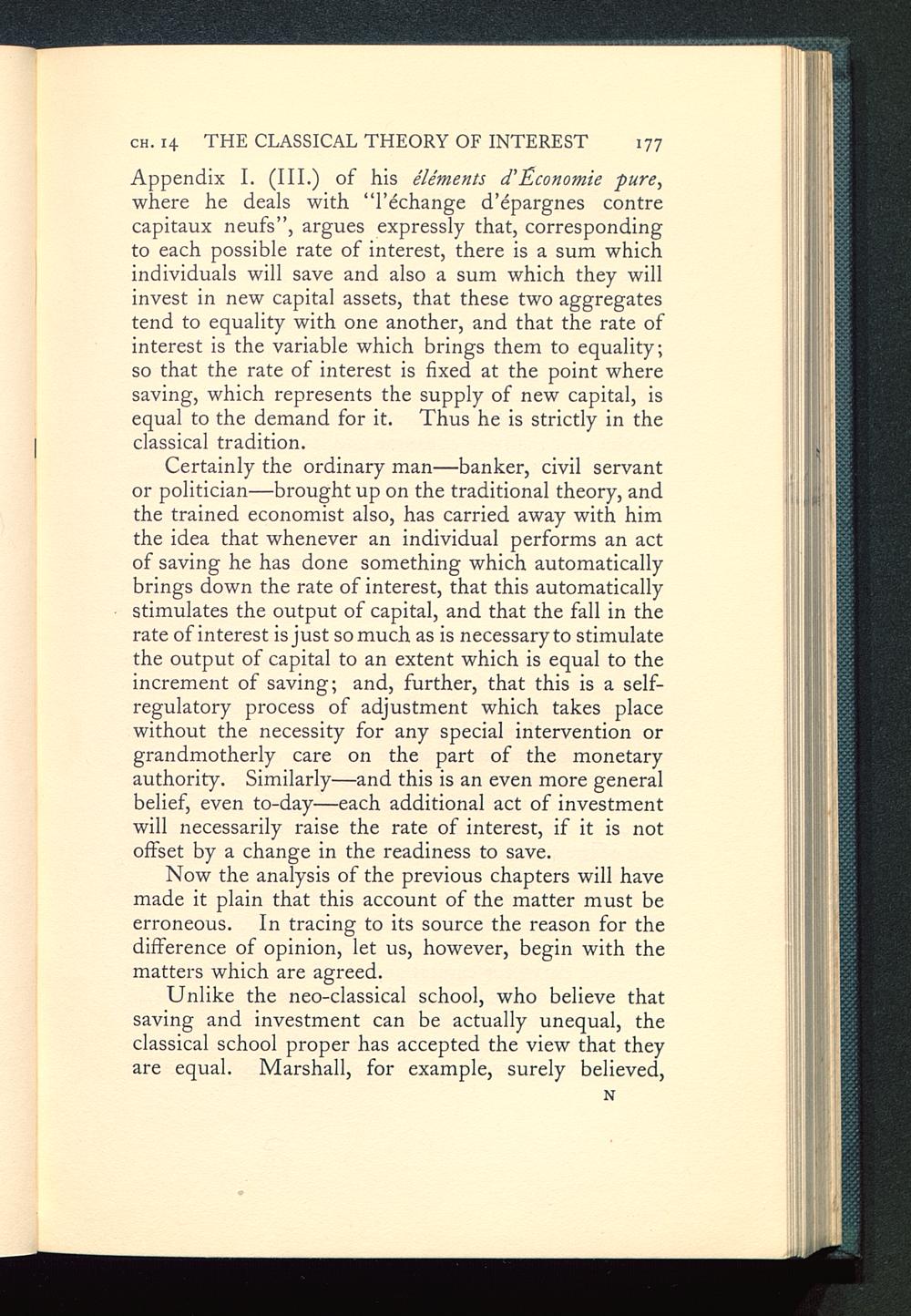 Appendix I. (III.) of his éléments d’Économic pure , where he deals with “l’échange d’épargnes contre capitaux neufs”, argues expressly that, corresponding to each possible rate of interest, there is a sum which individuals will save and also a sum which they will invest in new capital assets, that these two aggregates tend to equality with one another, and that the rate of interest is the variable which brings them to equality; so that the rate of interest is fixed at the point where saving, which represents the supply of new capital, is equal to the demand for it. Thus he is strictly in the classical tradition.