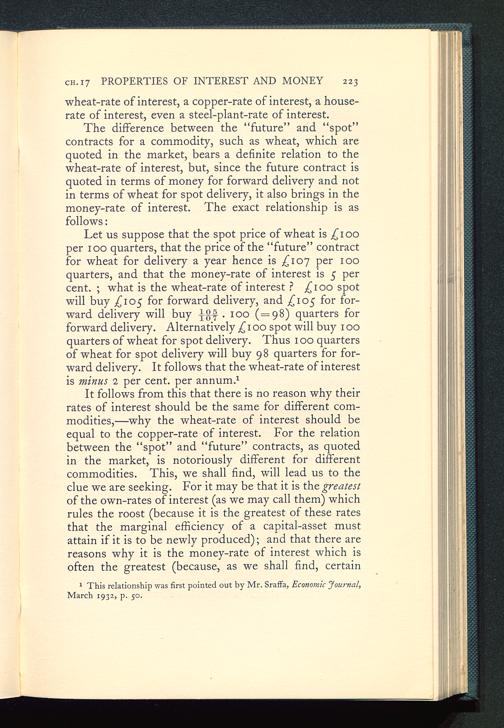 It follows from this that there is no reason why theirrates of interest should be the same for different com-modities,—why the wheat-rate of interest should beequal to the copper-rate of interest. For the relationbetween the “spot” and “future” contracts, as quotedin the market, is notoriously different for differentcommodities. This, we shall find, will lead us to theclue we are seeking. For it may be that it is the greatestof the own-rates of interest (as we may call them) whichrules the roost (because it is the greatest of these ratesthat the marginal efficiency of a capital-asset mustattain if it is to be newly produced); and that there arereasons why it is the money-rate of interest which isoften the greatest (because, as we shall find, certain