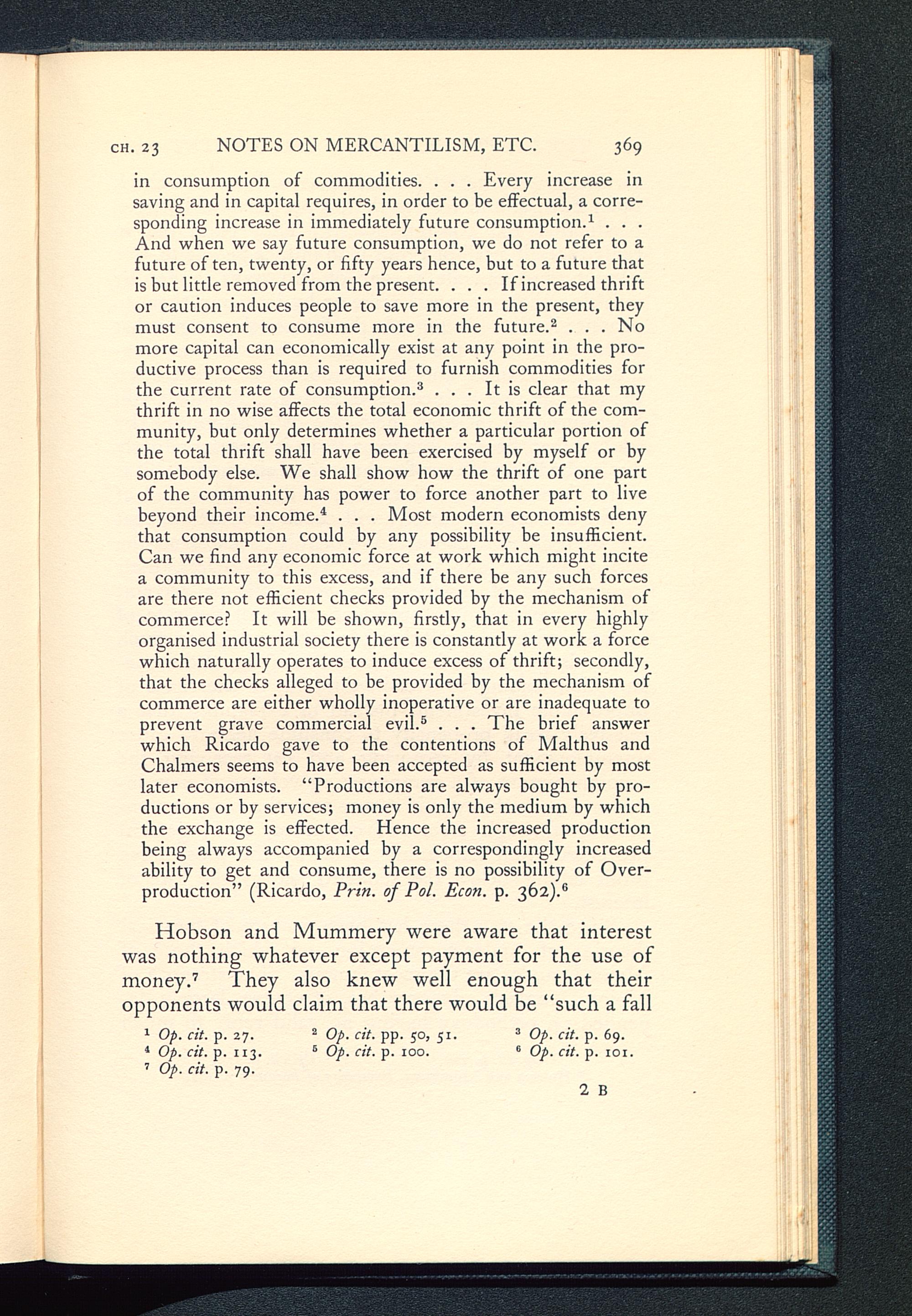 in consumption of commodities. . . . Every increase insaving and in capital requires, in order to be effectual, a corre-sponding increase in immediately future consumption. 1 . . .And when we say future consumption, we do not refer to afuture of ten, twenty, or fifty years hence, but to a future thatis but little removed from the present. . . . If increased thriftor caution induces people to save more in the present, theymust consent to consume more in the future. 2 . . . Nomore capital can economically exist at any point in the pro-ductive process than is required to furnish commodities forthe current rate of consumption. 3 ... It is clear that mythrift in no wise affects the total economic thrift of the com-munity, but only determines whether a particular portion ofthe total thrift shall have been exercised by myself or bysomebody else. We shall show how the thrift of one partof the community has power to force another part to livebeyond their income. 4 . . . Most modern economists denythat consumption could by any possibility be insufficient.Can we find any economic force at work which might incitea community to this excess, and if there be any such forcesare there not efficient checks provided by the mechanism ofcommerce? It will be shown, firstly, that in every highlyorganised industrial society there is constantly at work a forcewhich naturally operates to induce excess of thrift; secondly,that the checks alleged to be provided by the mechanism ofcommerce are either wholly inoperative or are inadequate toprevent grave commercial evil. 5 . . . The brief answerwhich Ricardo gave to the contentions of Malthus andChalmers seems to have been accepted as sufficient by mostlater economists. “Productions are always bought by pro-ductions or by services; money is only the medium by whichthe exchange is effected. Hence the increased productionbeing always accompanied by a correspondingly increasedability to get and consume, there is no possibility of Over-production” (Ricardo, Prin. of Pol. Econ. p. 362).®