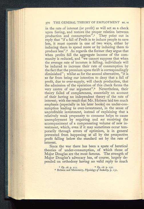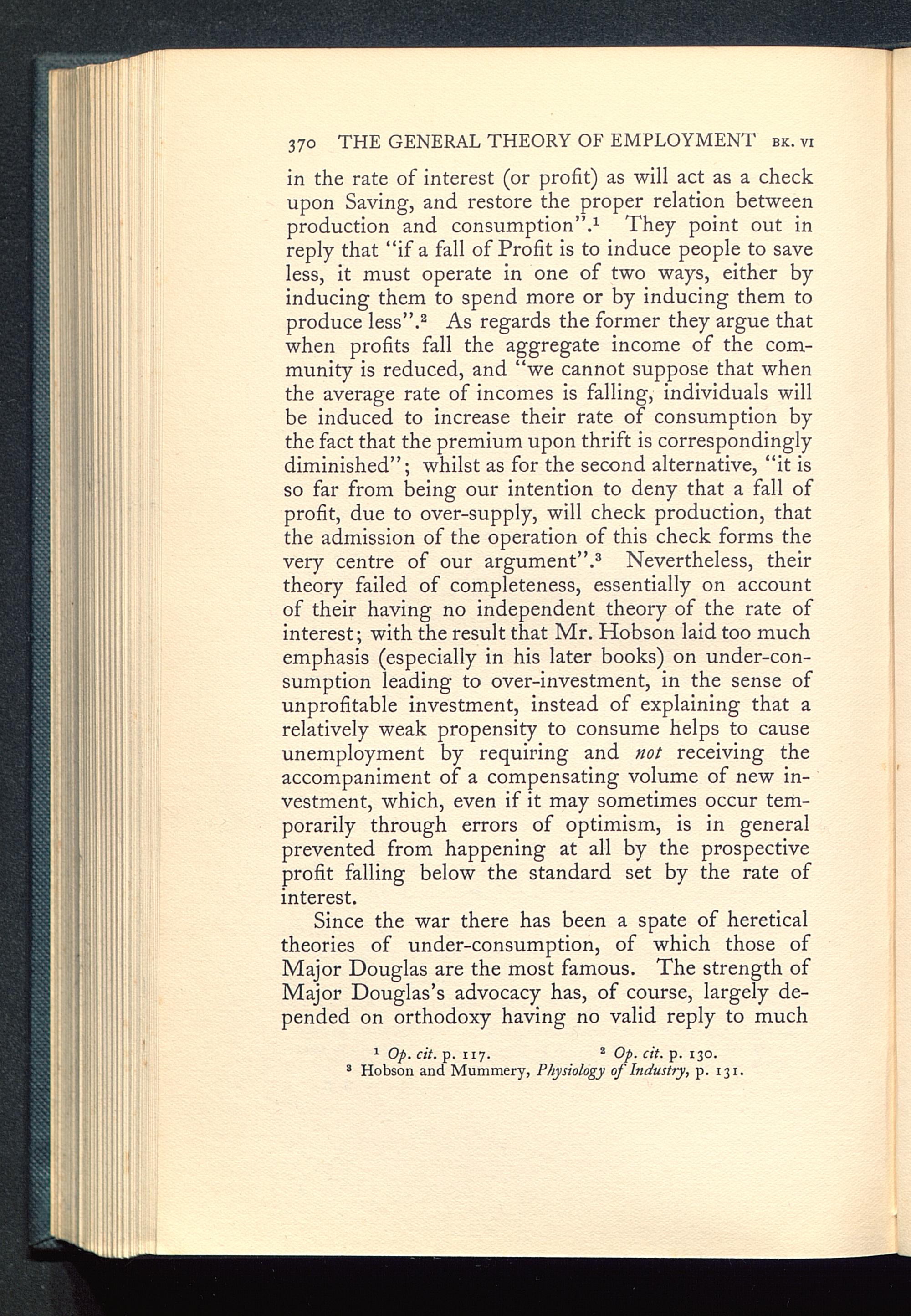 in the rate of interest (or profit) as will act as a checkupon Saving , and restore the proper relation betweenproduction and consumption ”. 1 They point out inreply that “if a fall of Profit is to induce people to saveless, it must operate in one of two ways, either byinducing them to spend more or by inducing them toproduce less ”. 2 As regards the former they argue thatwhen profits fall the aggregate income of the com-munity is reduced, and “we cannot suppose that whenthe average rate of incomes is falling, individuals willbe induced to increase their rate of consumption bythe fact that the premium upon thrift is correspondinglydiminished”; whilst as for the second alternative, “it isso far from being our intention to deny that a fall ofprofit, due to over-supply, will check production, thatthe admission of the operation of this check forms thevery centre of our argument ”. 3 Nevertheless, theirtheory failed of completeness, essentially on accountof their having no independent theory of the rate ofinterest; with the result that Mr. Hobson laid too muchemphasis (especially in his later books) on under-con-sumption leading to over-investment, in the sense ofunprofitable investment, instead of explaining that arelatively weak propensity to consume helps to causeunemployment by requiring and not receiving theaccompaniment of a compensating volume of new in-vestment, which, even if it may sometimes occur tem-porarily through errors of optimism, is in generalprevented from happening at all by the prospectiveprofit falling below the standard set by the rate ofinterest.