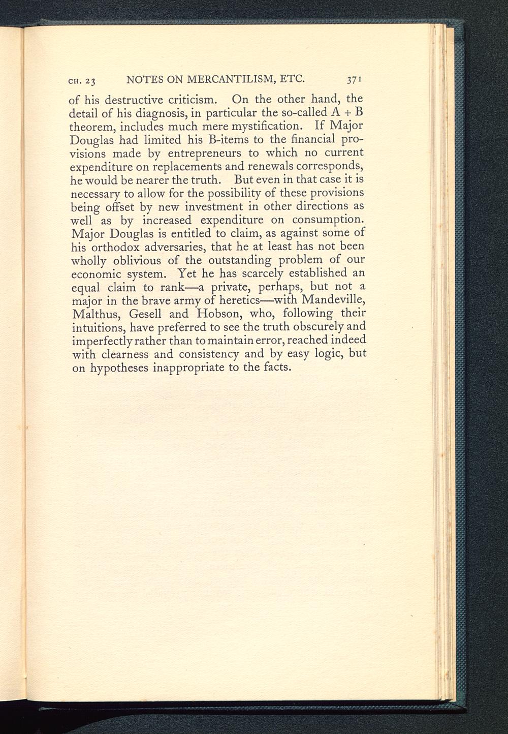 of his destructive criticism. On the other hand, thedetail of his diagnosis, in particular the so-called A + Btheorem, includes much mere mystification. If MajorDouglas had limited his B-items to the financial pro-visions made by entrepreneurs to which no currentexpenditure on replacements and renewals corresponds,he would be nearer the truth. But even in that case it isnecessary to allow for the possibility of these provisionsbeing offset by new investment in other directions aswell as by increased expenditure on consumption.Major Douglas is entitled to claim, as against some ofhis orthodox adversaries, that he at least has not beenwholly oblivious of the outstanding problem of oureconomic system. Yet he has scarcely established anequal claim to rank—a private, perhaps, but not amajor in the brave army of heretics—with Mandeville,Malthus , Gesell and Hobson, who, following theirintuitions, have preferred to see the truth obscurely andimperfectly rather than to maintain error, reached indeedwith clearness and consistency and by easy logic, buton hypotheses inappropriate to the facts.