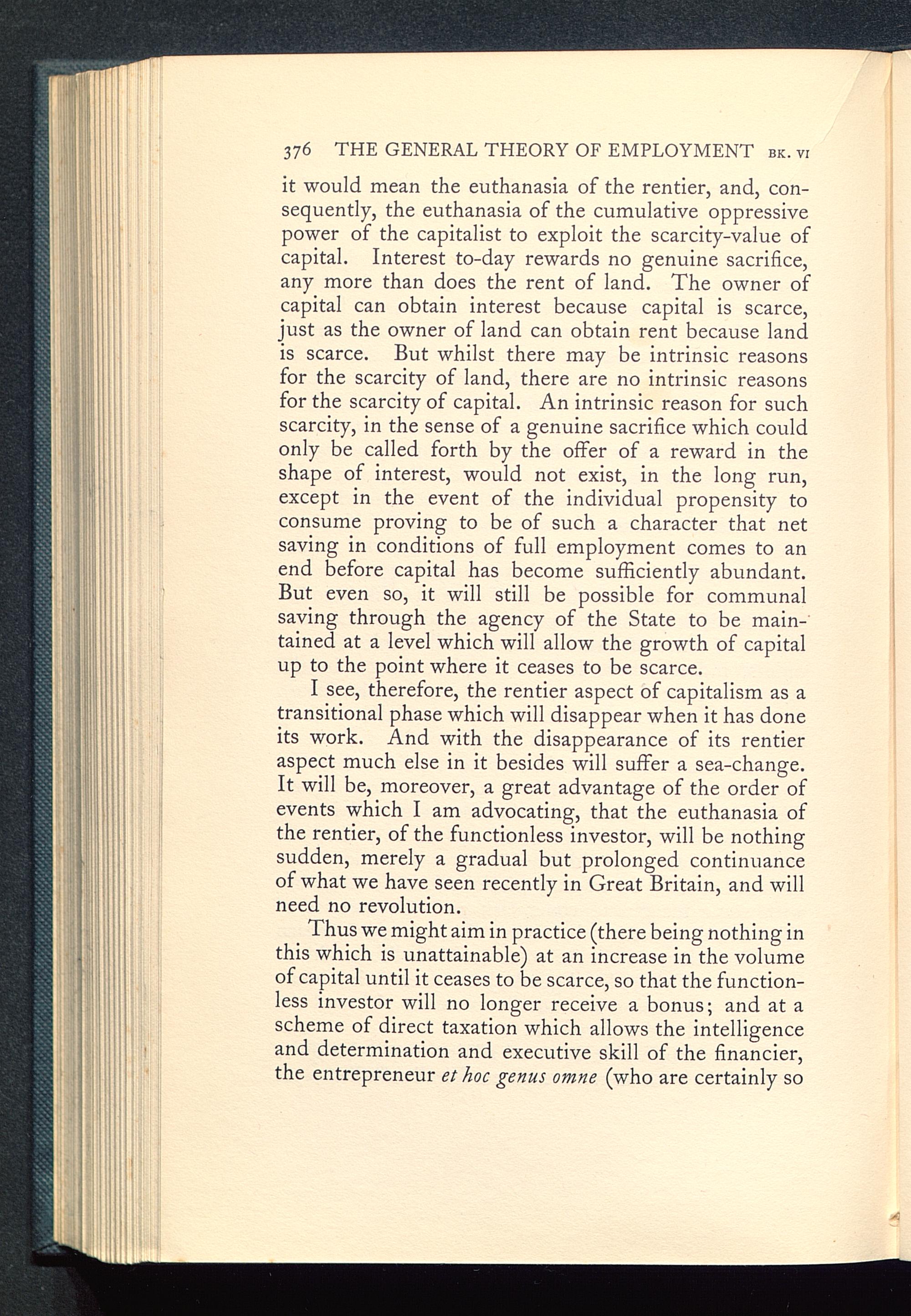 Thus we might aim in practice (there being nothing inthis which is unattainable) at an increase in the volumeof capital until it ceases to be scarce, so that the function-less investor will no longer receive a bonus; and at ascheme of direct taxation which allows the intelligenceand determination and executive skill of the financier,the entrepreneur et hoc genus omne (who are certainly so