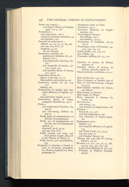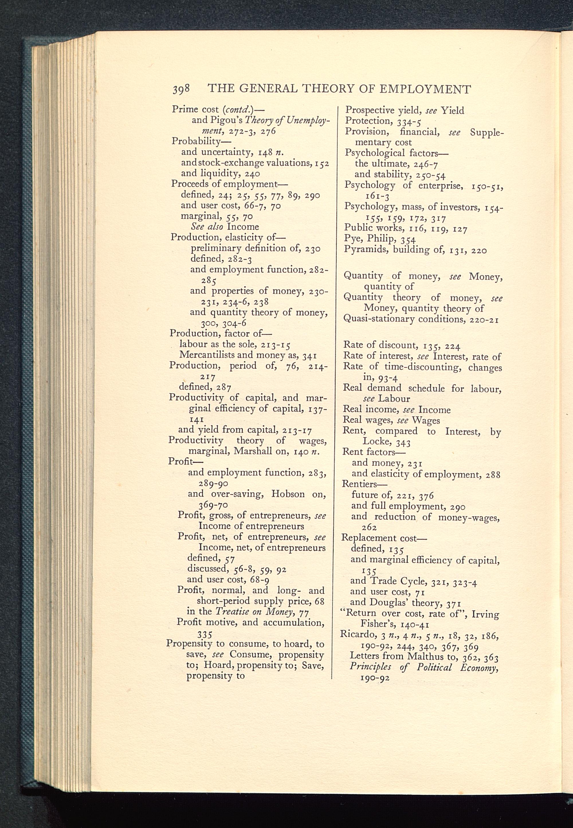 and Trade Cycle , 321, 323-4and user cost, 71and Douglas’ theory, 371“Return over cost, rate of”, IrvingFisher’s, 140-41