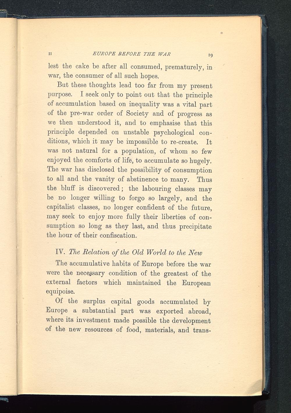 But these thoughts lead too far from my presentpurpose. I seek only to point out that the principleof accumulation based on inequality was a vital partof the pre-war order of Society and of progress aswe then understood it, and to emphasise that thisprinciple depended on unstable psychological con-ditions, which it may be impossible to re-create. Itwas not natural for a population, of whom so fewenjoyed the comforts of life, to accumulate so hugely.The war has disclosed the possibility of consumptionto all and the vanity of abstinence to many. Thusthe bluff is discovered; the labouring classes maybe no longer willing to forgo so largely, and thecapitalist classes, no longer confident of the future,may seek to enjoy more fully their liberties of con-sumption so long as they last, and thus precipitatethe hour of their confiscation.