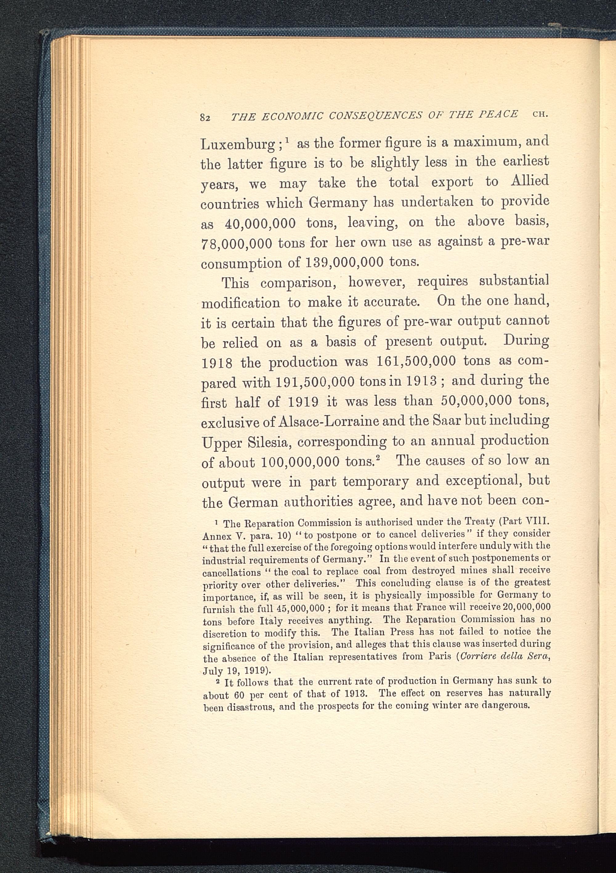 1 The Reparation Commission is authorised under the Treaty (Part VIII.Annex V. para. 10) "to postpone or to cancel deliveries" if they consider" that the full exercise of the foregoing options would interfere unduly with theindustrial requirements of Germany." In the event of such postponements orcancellations 11 the coal to replace coal from destroyed mines shall receivepriority over other deliveries." This concluding clause is of the greatestimportance, if, as will be seen, it is physically impossible for Germany tofurnish the full 45,000,000 ; for it means that France will receive 20,000,000tons before Italy receives anything. The Reparation Commission has nodiscretion to modify this. The Italian Press has not failed to notice thesignificance of the provision, and alleges that this clause was inserted duringthe absence of the Italian representatives from Paris (Corriere delta Sera,July 19, 1919).