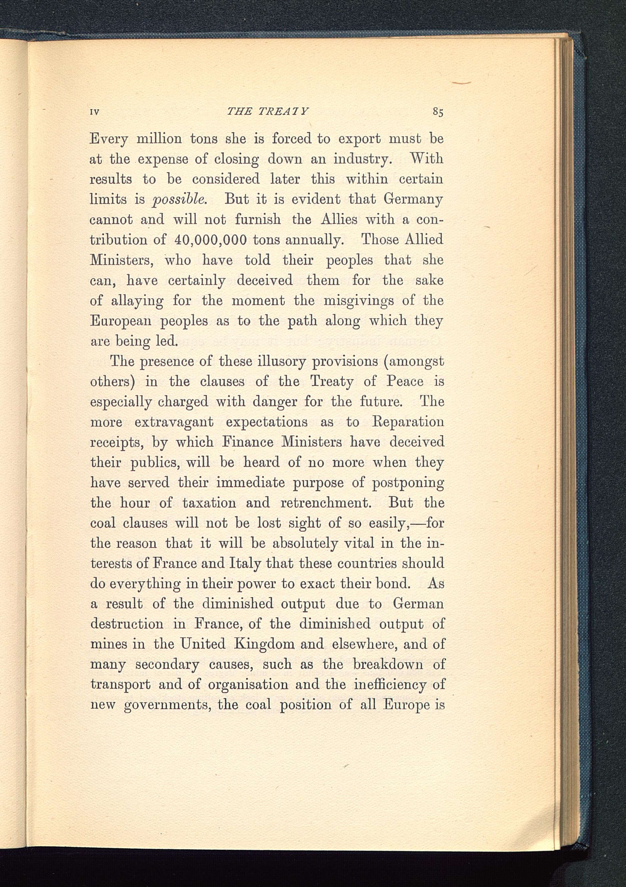 The presence of these illusory provisions (amongstothers) in the clauses of the Treaty of Peace isespecially charged with danger for the future. Themore extravagant expectations as to Reparationreceipts, by which Finance Ministers have deceivedtheir publics, will be heard of no more when theyhave served their immediate purpose of postponingthe hour of taxation and retrenchment. But thecoal clauses will not be lost sight of so easily,—forthe reason that it will be absolutely vital in the in-terests of France and Italy that these countries shoulddo everything in their power to exact their bond. Asa result of the diminished output due to Germandestruction in France , of the diminished output ofmines in the United Kingdom and elsewhere, and ofmany secondary causes, such as the breakdown oftransport and of organisation and the inefficiency ofnew governments, the coal position of all Europe is