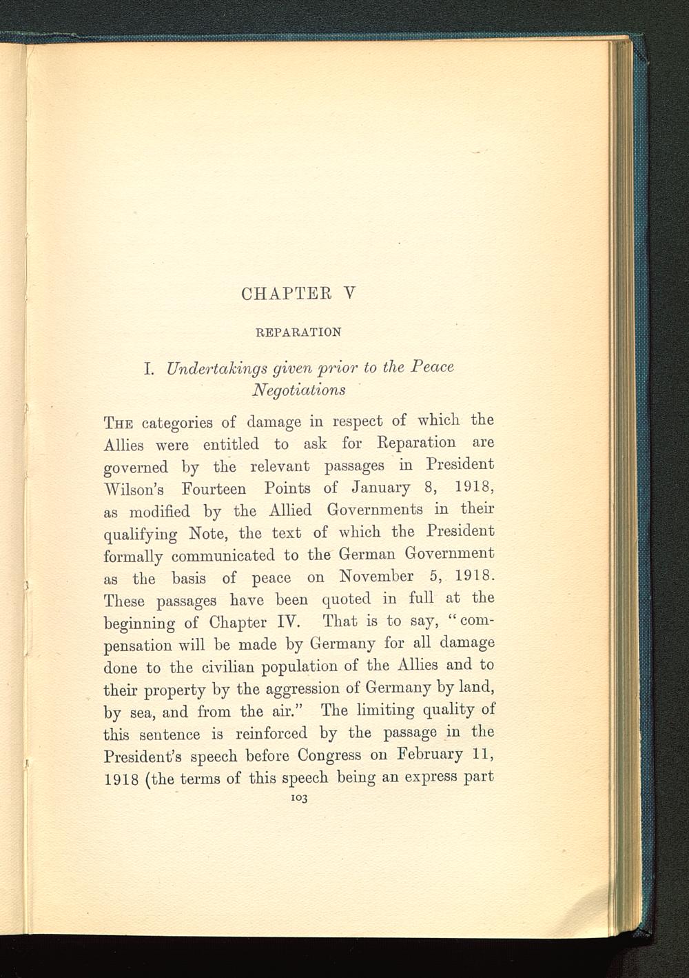 The categories of damage in respect of which theAllies were entitled to ask for Reparation aregoverned by the relevant passages in PresidentWilsons Fourteen Points of January 8, 1918,as modified by the Allied Governments in theirqualifying Note, the text of which the Presidentformally communicated to the German Governmentas the basis of peace on November 5, 1918.These passages have been quoted in full at thebeginning of Chapter IV. That is to say, " com-pensation will be made by Germany for all damagedone to the civilian population of the Allies and totheir property by the aggression of Germany by land,by sea, and from the air." The limiting quality ofthis sentence is reinforced by the passage in thePresident's speech before Congress on February 11,