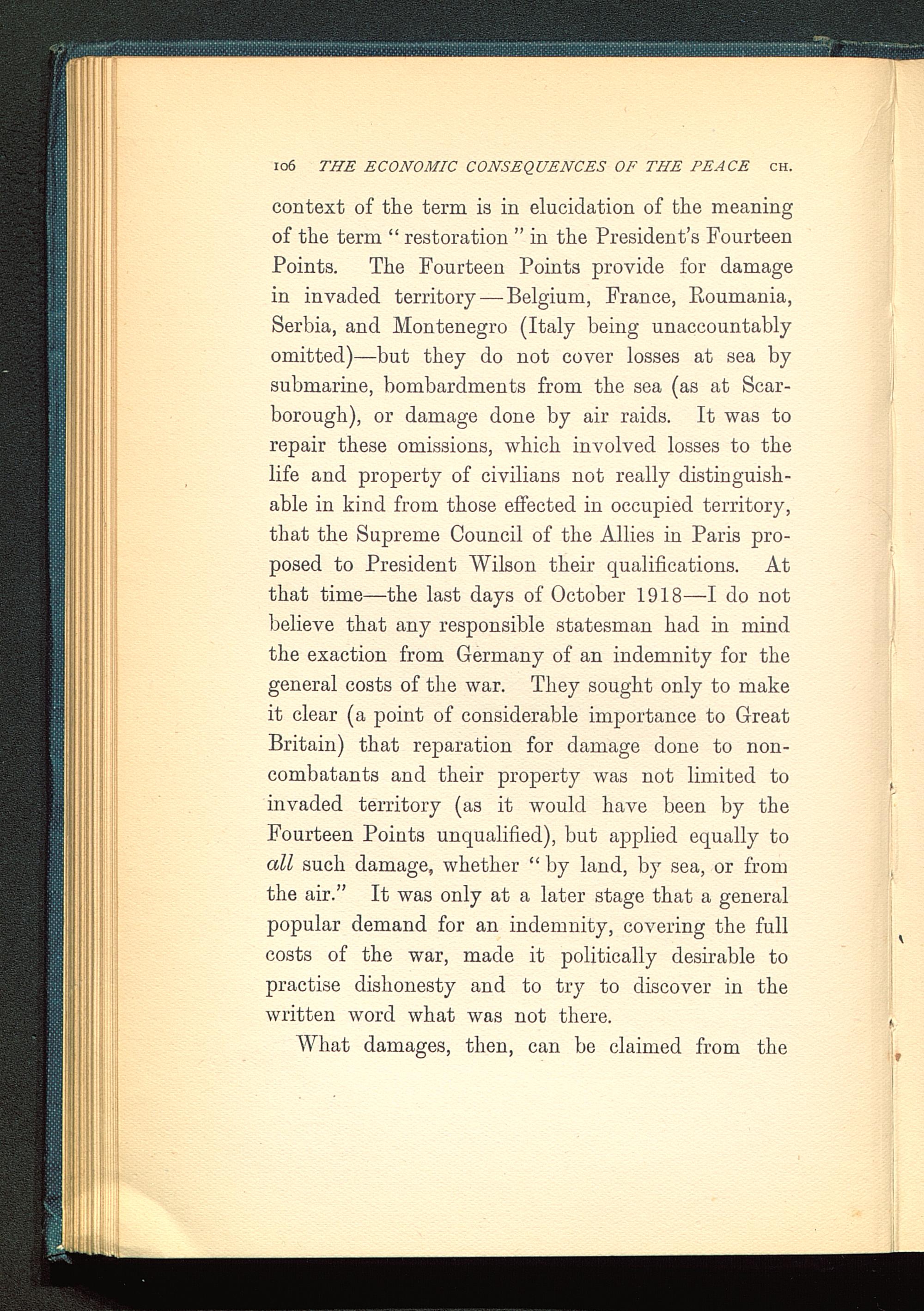 context of the term is in elucidation of the meaningof the term " restoration " in the President's FourteenPoints. The Fourteen Points provide for damagein invaded territory — Belgium, France, Roumania ,Serbia, and Montenegro (Italy being unaccountablyomitted)—but they do not cover losses at sea bysubmarine, bombardments from the sea (as at Scar-borough), or damage done by air raids. It was torepair these omissions, which involved losses to thelife and property of civilians not really distinguish-able in kind from those effected in occupied territory,that the Supreme Council of the Allies in Paris pro-posed to President Wilson their qualifications. Atthat time—the last days of October 1918—I do notbelieve that any responsible statesman had in mindthe exaction from Germany of an indemnity for thegeneral costs of the war. They sought only to makeit clear (a point of considerable importance to GreatBritain ) that reparation for damage done to non-combatants and their property was not limited toinvaded territory (as it would have been by theFourteen Points unqualified), but applied equally toall such damage, whether "by land, by sea, or fromthe air." It was only at a later stage that a generalpopular demand for an indemnity, covering the fullcosts of the war, made it politically desirable topractise dishonesty and to try to discover in thewritten word what was not there.