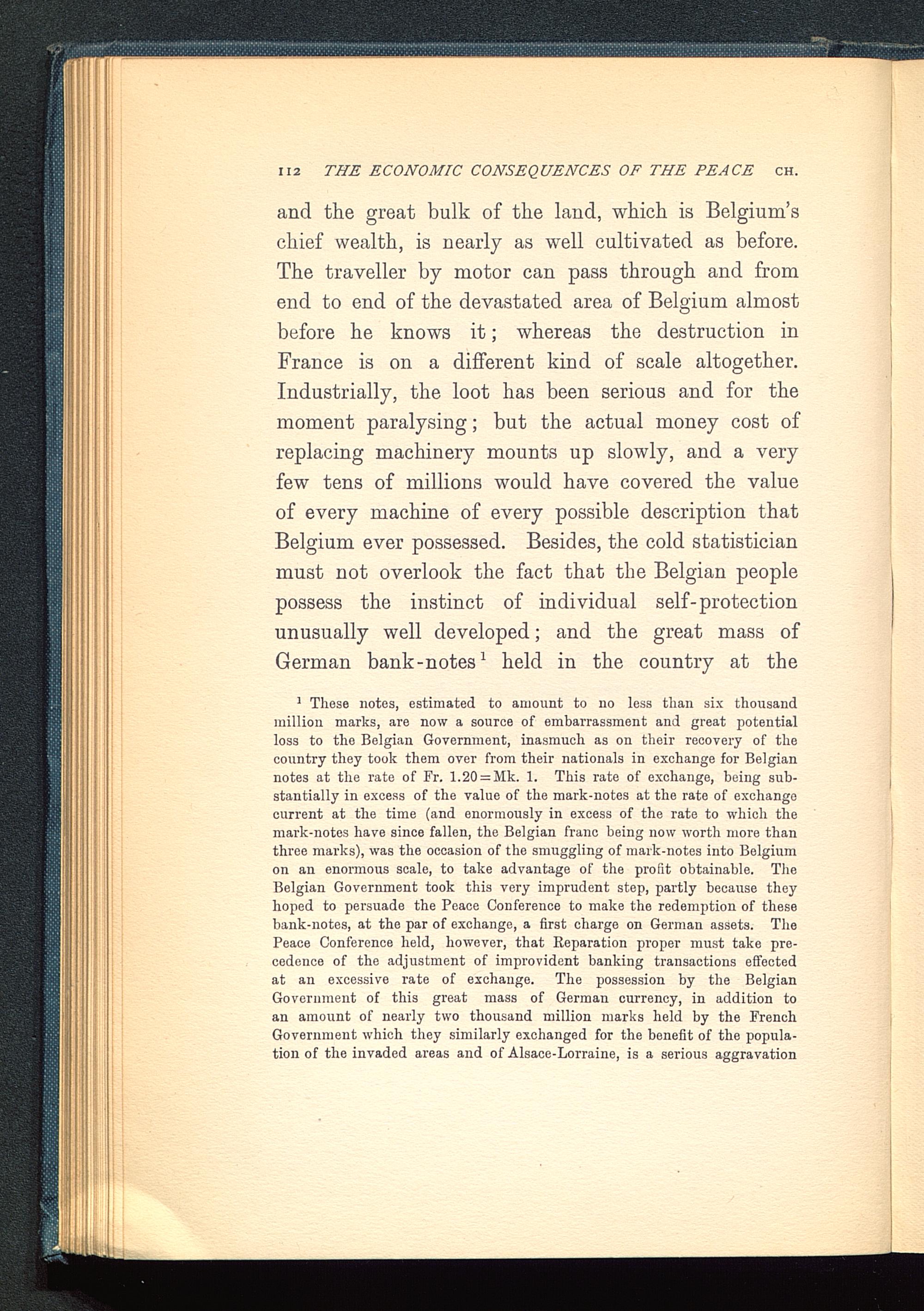 1 These notes, estimated to amount to no less than six thousandmillion marks, are now a source of embarrassment and great potentialloss to the Belgian Government, inasmuch as on their recovery of thecountry they took them over from their nationals in exchange for Belgian notes at the rate of Fr. 1.20 = Mk. 1. This rate of exchange, being sub-stantially in excess of the value of the mark-notes at the rate of exchangecurrent at the time (and enormously in excess of the rate to which themark-notes have since fallen, the Belgian franc being now worth more thanthree marks), was the occasion of the smuggling of mark-notes into Belgium on an enormous scale, to take advantage of the profit obtainable. TheBelgian Government took this very imprudent step, partly because theyhoped to persuade the Peace Conference to make the redemption of thesebank-notes, at the par of exchange, a first charge on German assets. ThePeace Conference held, however, that Reparation proper must take pre-cedence of the adjustment of improvident banking transactions effectedat an excessive rate of exchange. The possession by the Belgian Government of this great mass of German currency, in addition toan amount of nearly two thousand million marks held by the FrenchGovernment which they similarly exchanged for the benefit of the popula-tion of the invaded areas and of Alsace-Lorraine, is a serious aggravation