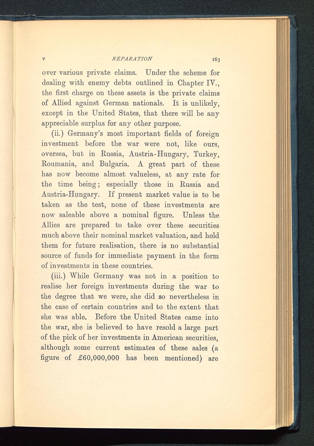 (ii.) Germany 's most important fields of foreigninvestment before the war were not, like ours,oversea, but in Russia, Austria - Hungary , Turkey,Roumania, and Bulgaria . A great part of thesehas now become almost valueless, at any rate forthe time being; especially those in Russia andAustria-Hungary . If present market value is to betaken as the test, none of these investments arenow saleable above a nominal figure. Unless theAllies are prepared to take over these securitiesmuch above their nominal market valuation, and holdthem for future realisation, there is no substantialsource of funds for immediate payment in the formof investments in these countries.