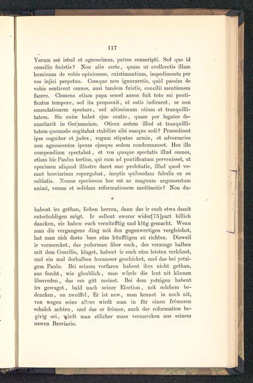 habent irs gethan, lieben herreu, dann das ir euch etwa damitentschuldigen mögt. Ir sollent ewerer wider| 75 |part billichdancken, sie haben euch vernünfftig und klug gemacht. Wennman die vergangene ding mit den gegenwertigen vergleichet,hat man sich desto bass zürn künfftigen zu richten. Dieweilir vermercket, das yederman über euch, des verzeugs halbenmit dem Concilio, klaget, habent ir euch zürn leisten verkunet,und ein mal derhalben herausser geschicket, und das bei yetzi-gem Paulo. Bei seinem vorfaren habent ihrs nicht gethan,aus forcht, wie gleublich, man wurds die leut nit könnenüberreden, das ers gut meinet. Bei dem yetzigen habentirs gewaget, bald nach seiner Election, mit solchem be-dencken, on zweirTel, Er ist new, man kennet in noch nit,von wegen seins aHers wirdt man in für einen frömerenschalck achten, und das er frömer, auch der reformation be-girig sei, wirdt man etlicher mass vermercken aus seinemnewen Breviario.