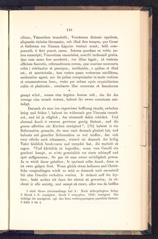 Darnach als man hin ongewisser hoffnung stonht, zwischenkrieg und friden ', habent irs widerumb gen Vincentz verord-net , und ist ja cläglich , das niemandt dahin schicket. Undabermal damit ir ewerem gewissen genüg thetent, und diegrosse affection zur Kirchen erzeigtent 2 , [76] habent ir einReformation gemacht, die man euch darnach glosiert hat, undhabents mit gemelter Reformation so wol troffen, das sichewer etliche auch schammen, wiewol sie dennoch der heiligVater höchlich beschworen und vere_ydet hat, die warheit zusagen. 3 Und kiirtzlich zu begreifen, wenn vom Concili eingeschrei kompt, so wirfcs gemeinlich vor einen schimpff undspot auffgenomen, So gar ist man ewrer subtiligkeit gewon.Ja es wirdt davor gehalten, Ir spottent selbs damit, denn esist ewre galgen frist. Wenn gleich etwas heilsams und Christ-iichs vorgeschlagen wirdt so muß es dennoch umb ewrentwilbiß zum Concilio verhalten werden. Ir stehent auff der ley-tern , habt anders nit dann des abstoß zu gewarten, da su-chent ir alle außzüg, und nempt zu stewr, alles was da helffen
