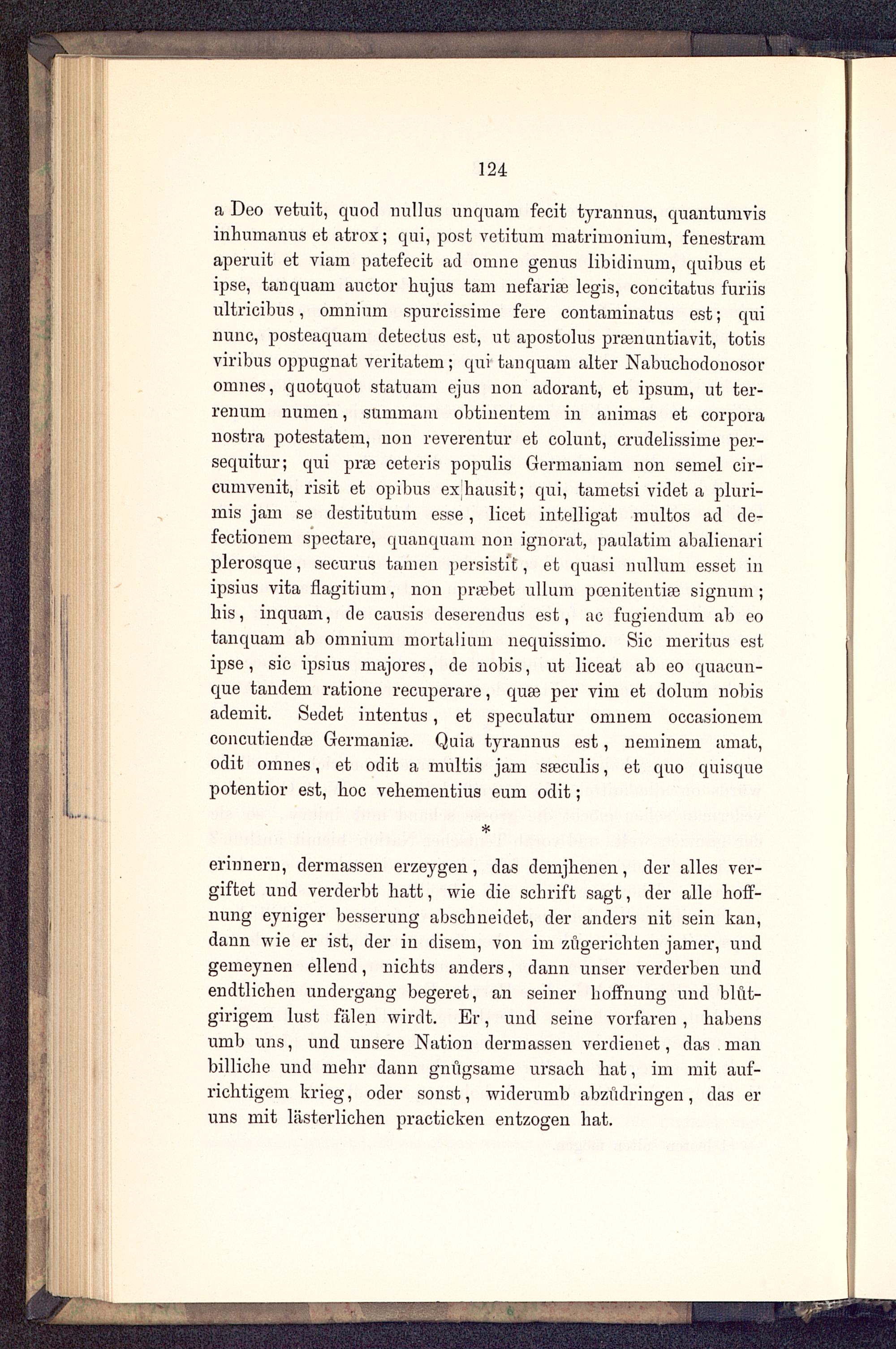 a Deo vetuit, quod nullus unquara fecit tyrannus, quantumvisinhumanus et atrox; qui, post vetitum matrimonium, fenestramaperuit et viam patefecit ad omne genus libidinum, quibus etipse, tan quam auctor hujus tarn nefarise legis, concitatns furiisültricibus, omuium spurcissime fere contaminatus est; quinunc, posteaquam detectus est, ut apostolns pramuntiavit, totisviribus oppugnat veritatem; qui tanquam alter Nabuchodonosoromnes, quotquot statuam ejus non adorant, et ipsum, ut ter-renum numen, summam obtineutem in animas et corporanostra potestatem, non reverentur et coluut, crudelissiine per-sequitur; qui prse ceteris populis Germauiam non semel cir-cumveuit, risit et opibua exhausit; qui, tametsi videt a pluri-mis jam se destitutum esse, licet intelligat multos ad de-fectionem spectare, quanquam non ignorat, ]iaalatim abalienariplerosque, securus tarnen persistit, et quasi nullum esset inipsius vita flagitium, non praebet ulluin pceniteutia3 Signum;bis, in quam, de cansis deserendns est, ac fugiendum ab eotanquam ab omnium mortalium nequissimo. Sic meritus estipse, sie ipsius majores, de nobis, ut liceat ab eo quaeun-que tandem ratione recuperare, quas per vim et dolum nobisademit. Sedet intentus, et speculatur omoem occasionemconeutiendaa Germania;. Quia tyrannus est, neminem amat,odit omnes, et odit a mültis jam saeculis, et quo quisquepotentior est, boc vebementius eum odit;