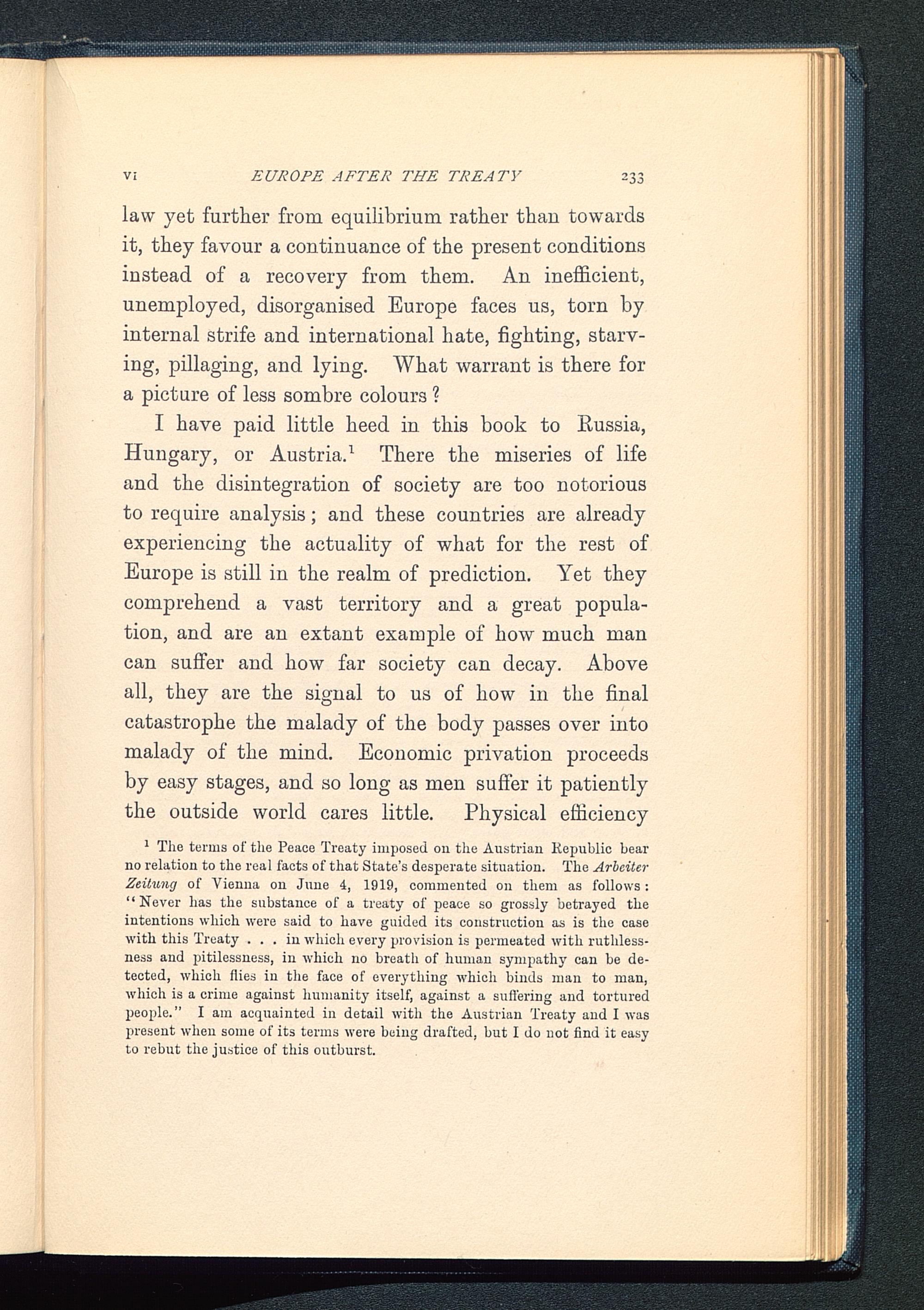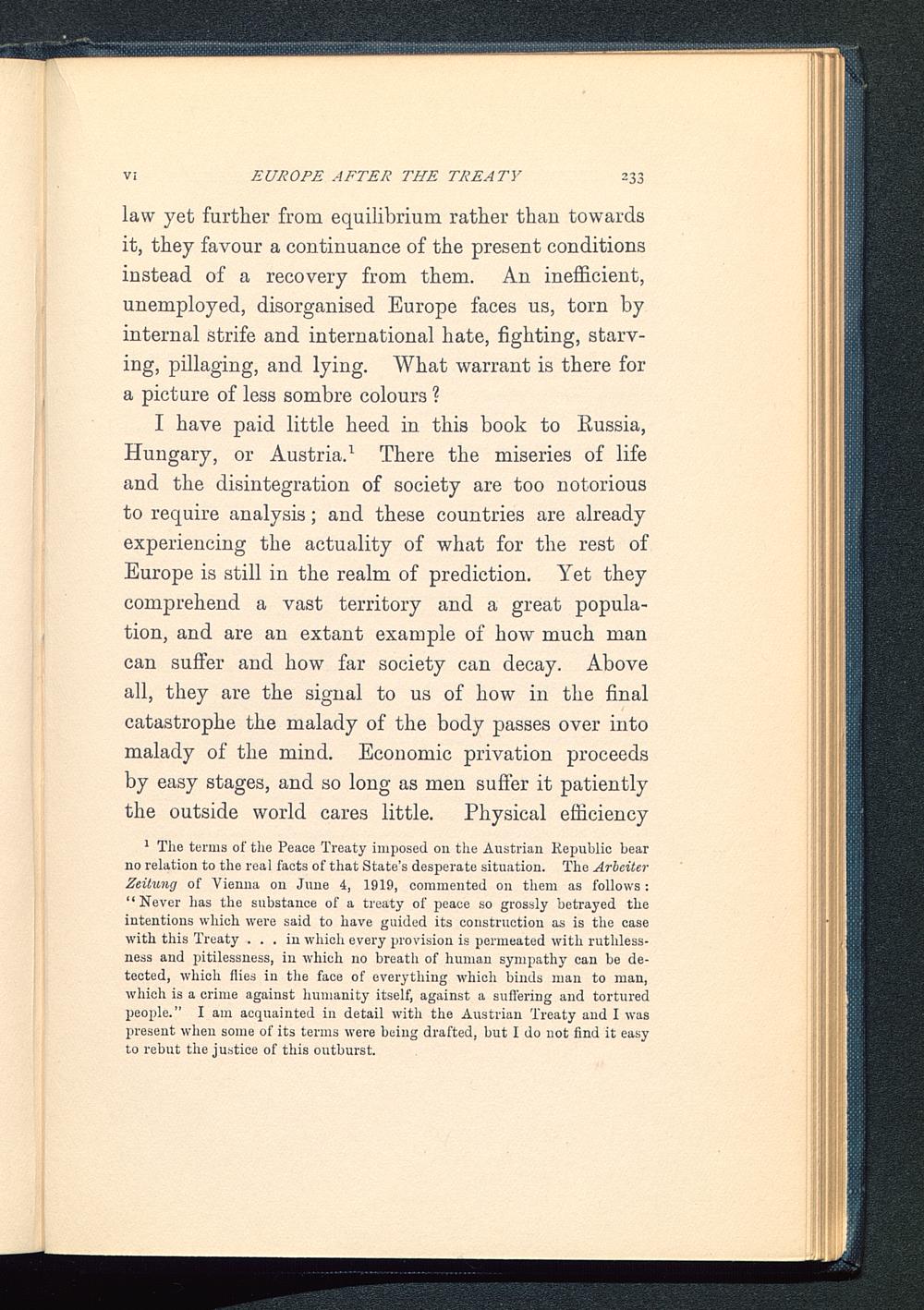1 The terms of the Peace Treaty imposed on the Austrian Republic bearno relation to the real facts of that State's desperate situation. The ArbciterZeitung of Vienna on June 4, 1919, commented on them as follows:"Never has the substance of a treaty of peace so grossly betrayed theintentions which were said to have guided its construction as is the casewith this Treaty . . . in which every provision is permeated with ruthless-ness and pitilessness, in "which no breath of human sympathy can be de-tected, which flies in the face of everything which binds man to man,which is a crime against humanity itself, against a suffering and torturedpeople." I am acquainted in detail with the Austrian Treaty and I waspresent when some of its terms were being drafted, but I do not find it easyto rebut the justice of this outburst.