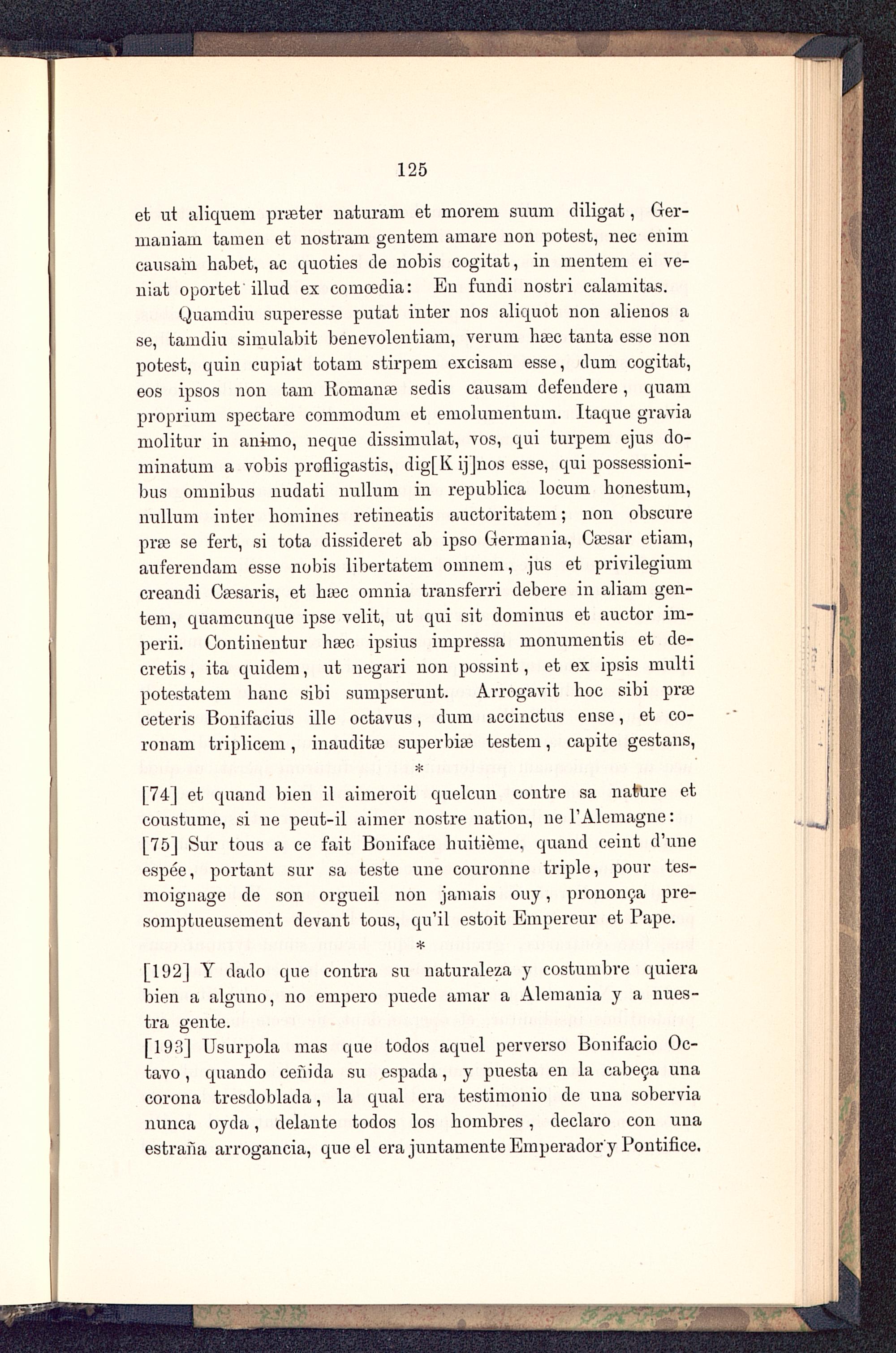 [74] et quam! bien il aimeroit quelcun contre sa nature etcoustume, si ne peut-ü aimer nostre uatiou, nel'Alemagne:[75] Sur tous a ce fait Boniface huitieme, quand ceint d'uneespee, portant sur sa teste une couronne triple, pour tes-moignage de son orgueil non jamais ouy, prononca pre-somptueusement devant tous, qu'il estoit Empereur et Pape.