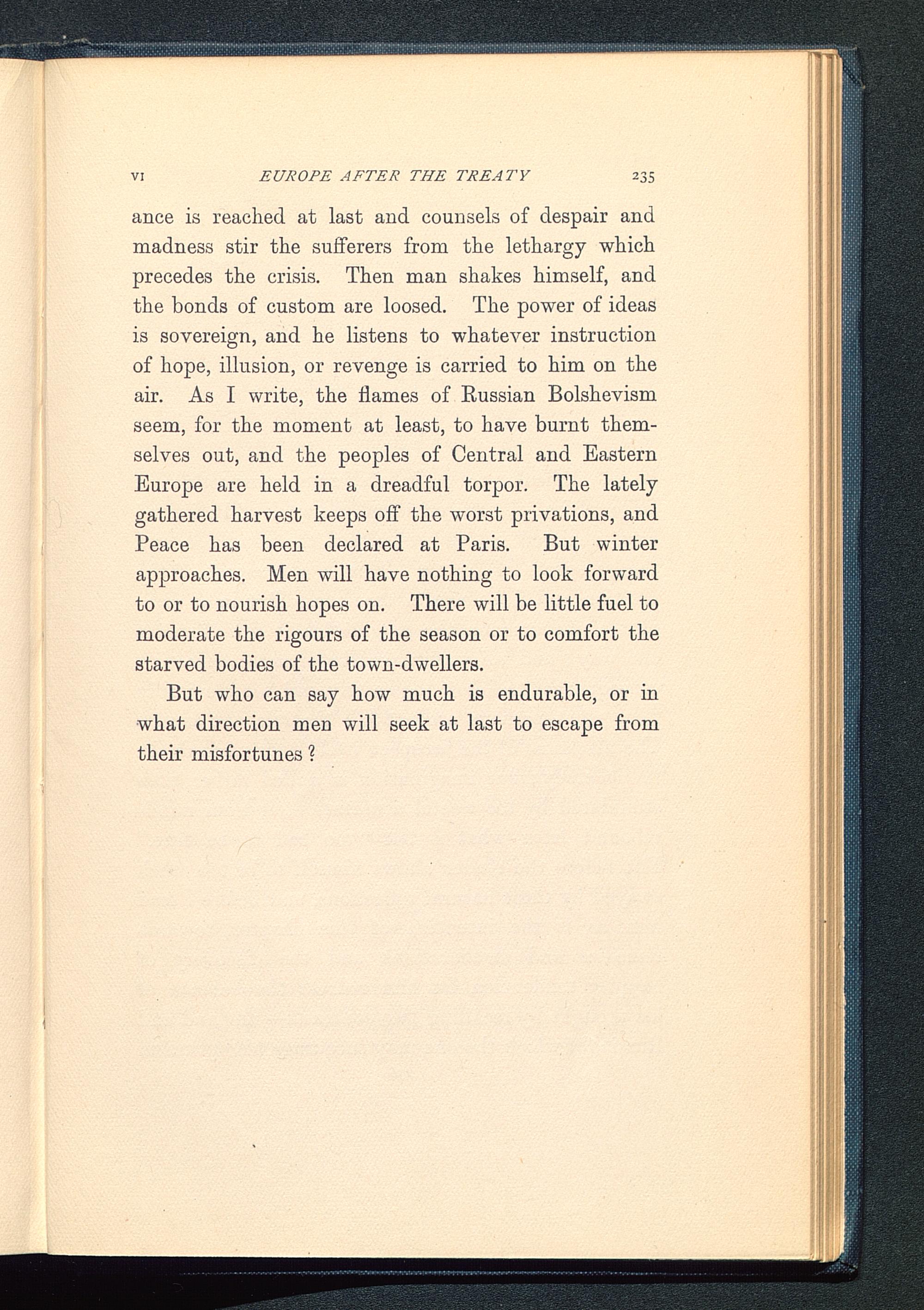 ance is reached at last and counsels of despair andmadness stir the sufferers from the lethargy whichprecedes the crisis. Then man shakes himself, andthe bonds of custom are loosed. The power of ideasis sovereign, and he listens to whatever instructionof hope, illusion, or revenge is carried to him on theair. As I write, the flames of Russian Bolshevismseem, for the moment at least, to have burnt them-selves out, and the peoples of Central and EasternEurope are held in a dreadful torpor. The latelygathered harvest keeps off the worst privations, andPeace has been declared at Paris . But winterapproaches. Men will have nothing to look forwardto or to nourish hopes on. There will be little fuel tomoderate the rigours of the season or to comfort thestarved bodies of the town-dwellers.
