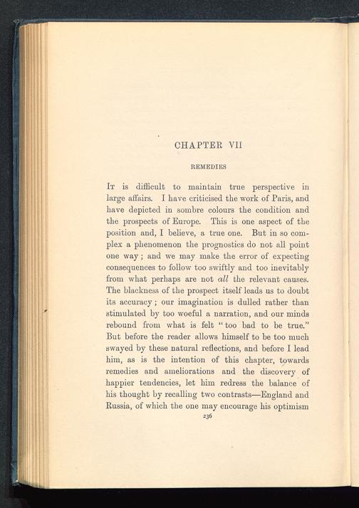 It is difficult to maintain true perspective inlarge affairs. I have criticised the work of Paris , andhave depicted in sombre colours the condition andthe prospects of Europe . This is one aspect of theposition and, I believe, a true one. But in so com-plex a phenomenon the prognostics do not all pointone way ; and we may make the error of expectingconsequences to follow too swiftly and too inevitablyfrom what perhaps are not all the relevant causes.The blackness of the prospect itself leads us to doubtits accuracy ; our imagination is dulled rather thanstimulated by too woeful a narration, and our mindsrebound from what is felt " too bad to be true."But before the reader allows himself to be too muchswayed by these natural reflections, and before I leadhim, as is the intention of this chapter, towardsremedies and ameliorations and the discovery ofhappier tendencies, let him redress the balance ofhis thought by recalling two contrasts—England and