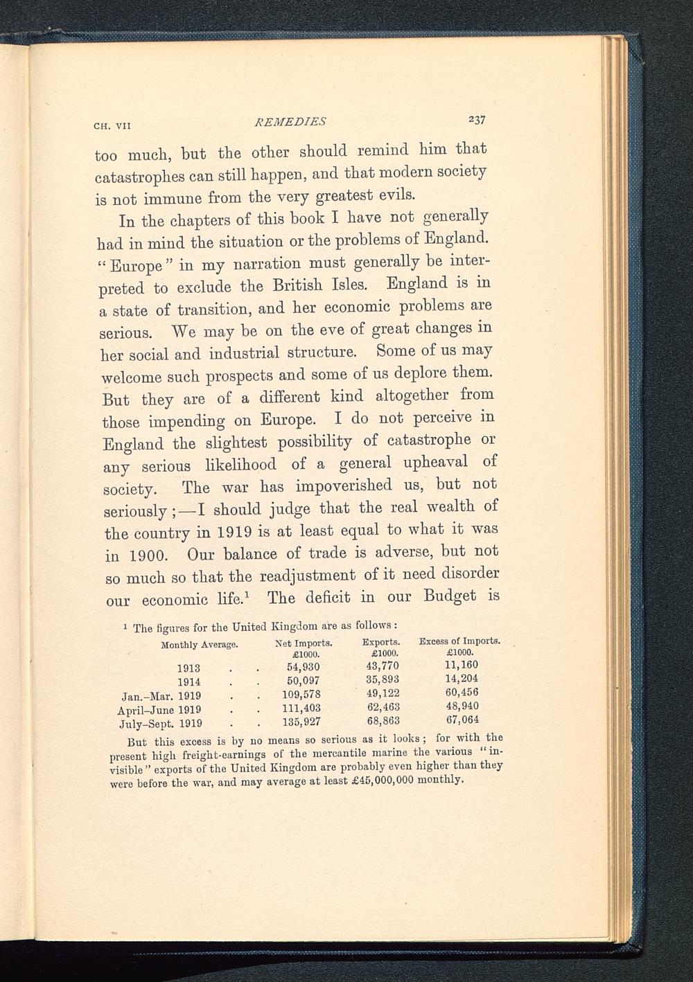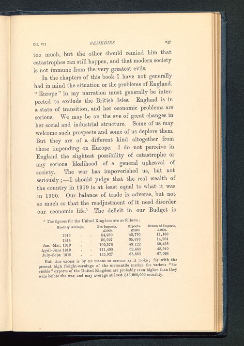 In the chapters of this book I have not generallyhad in mind the situation or the problems of England ." Europe " in my narration must generally be inter-preted to exclude the British Isles. England is ina state of transition, and her economic problems areserious. We may be on the eve of great changes inher social and industrial structure. Some of us maywelcome such prospects and some of us deplore them.But they are of a different kind altogether fromthose impending on Europe . I do not perceive inEngland the slightest possibility of catastrophe orany serious likelihood of a general upheaval ofsociety. The war has impoverished us, but notseriously;—I should judge that the real wealth ofthe country in 1919 is at least equal to what it wasin 1900. Our balance of trade is adverse, but notso much so that the readjustment of it need disorderour economic life. 1 The deficit in our Budget is