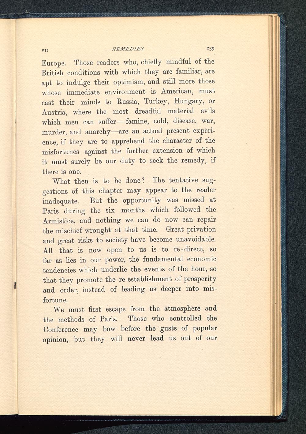 What then is to be done ? The tentative sug-gestions of this chapter may appear to the readerinadequate. But the opportunity was missed atParis during the six months which followed theArmistice, and nothing we can do now can repairthe mischief wrought at that time. Great privationand great risks to society have become unavoidable.All that is now open to us is to re-direct, sofar as lies in our power, the fundamental economictendencies which underlie the events of the hour, sothat they promote the re-establishment of prosperityand order, instead of leading us deeper into mis-fortune.
