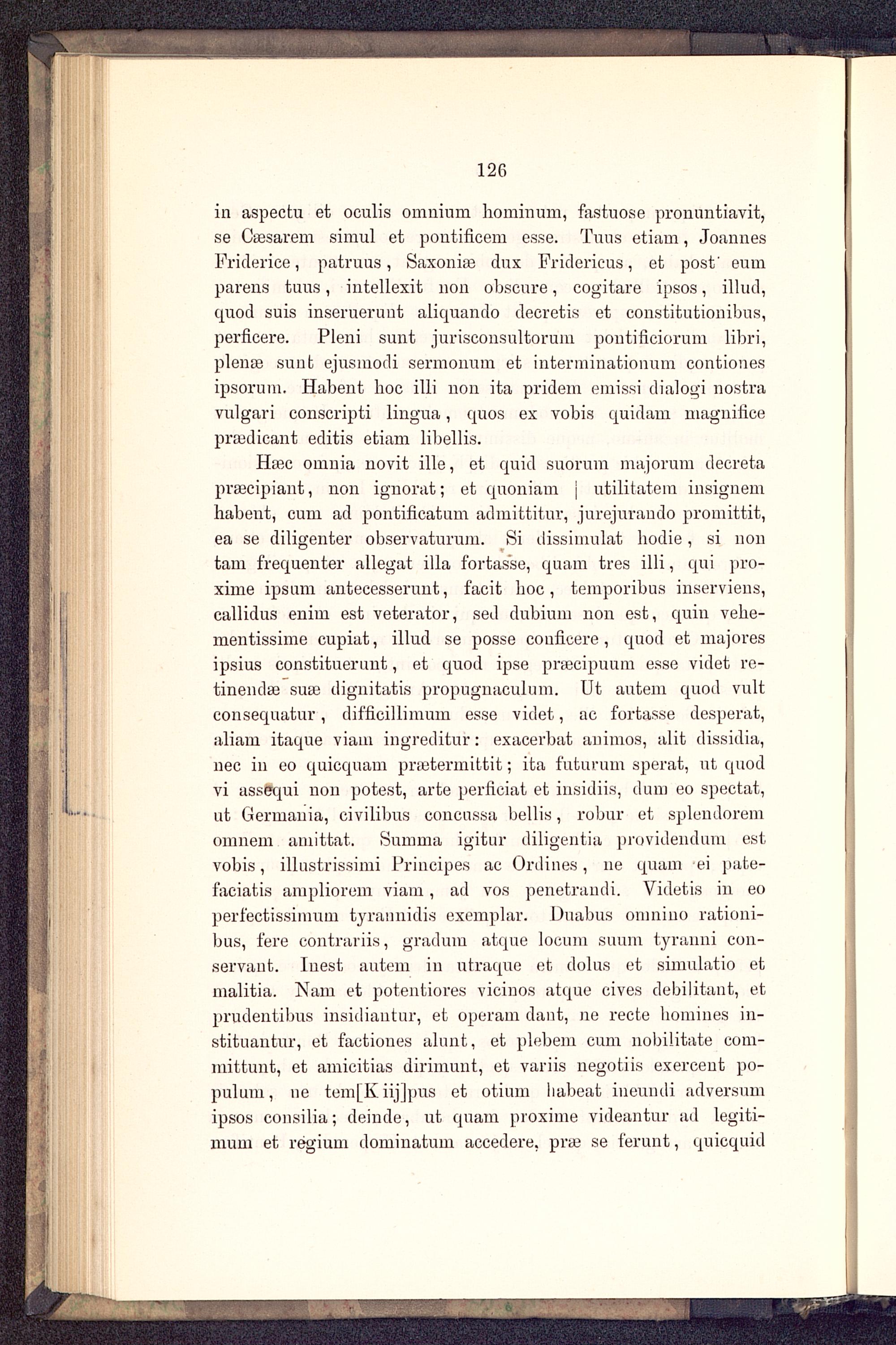 in aspectu et oculis omnium hominum, fastuose pronüntiavit,ae CsBsarem simul et pontificem esse. Tuns etiäm, JoannesFriderice, patruus, Saxonia} dux Friderieus, et posf enmparens tuns, intellexit non obscure, cogitare ipsos, illnil,quod suis inseruerunt aliquando decretis et constitutionibus,perficere. Pleni sunt jurisconsultorum pontificiorum libri,plensB sunt ejusmodi sermonum et interminationum contionesipsorura. Habent hoc illi non ita pridem eniissi dialogi nostravulgari conscripti lingua, quos ex vobis quidam magnificepraulicant editis etiäm libellis.