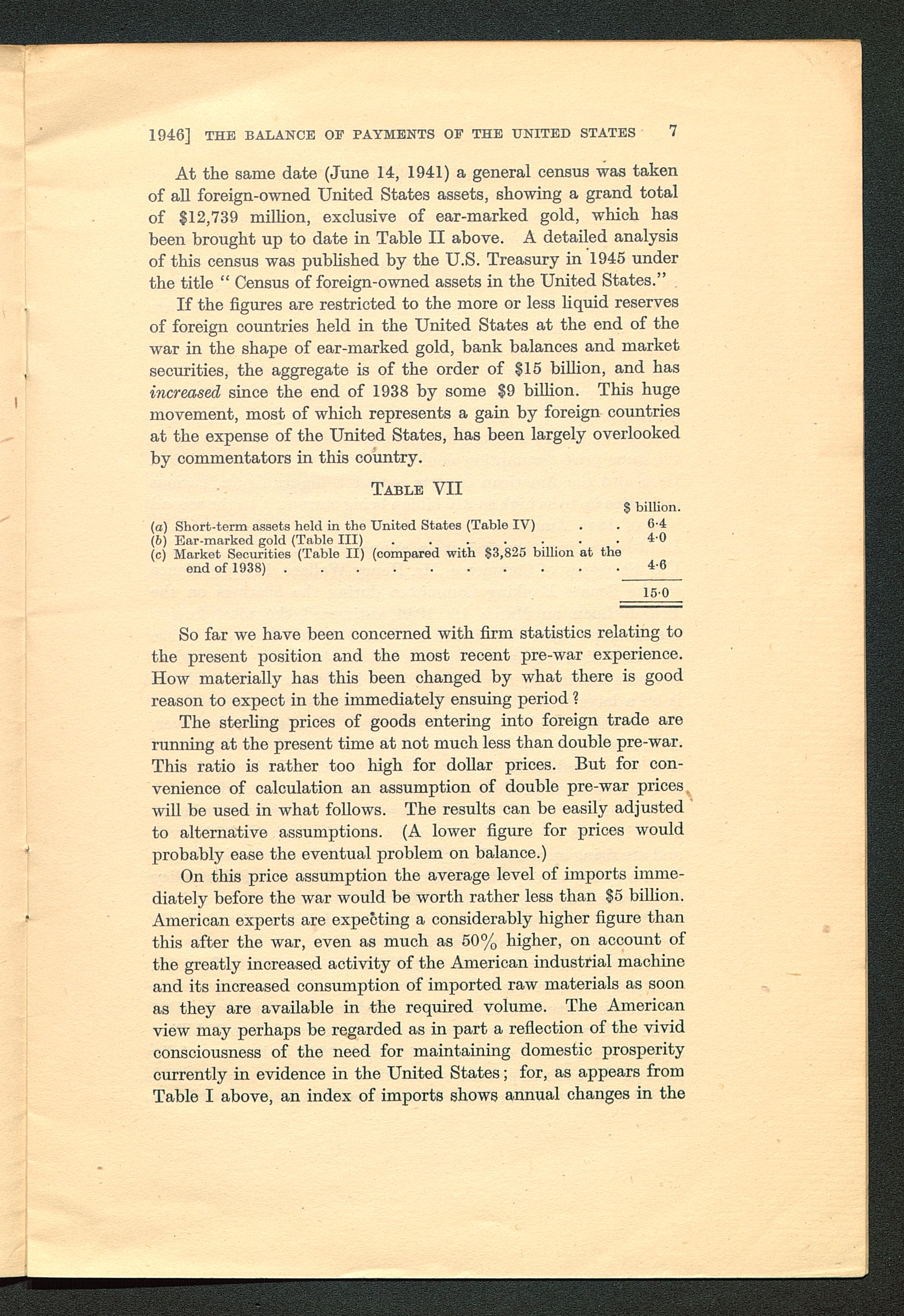 If the figures are restricted to the more or less liquid reservesof foreign countries held in the United States at the end of thewar in the shape of ear-marked gold, bank balances and marketsecurities, the aggregate is of the order of $15 billion, and hasincreased since the end of 1938 by some $9 billion. This hugemovement, most of which represents a gain by foreign countriesat the expense of the United States , has been largely overlookedby commentators in this country.