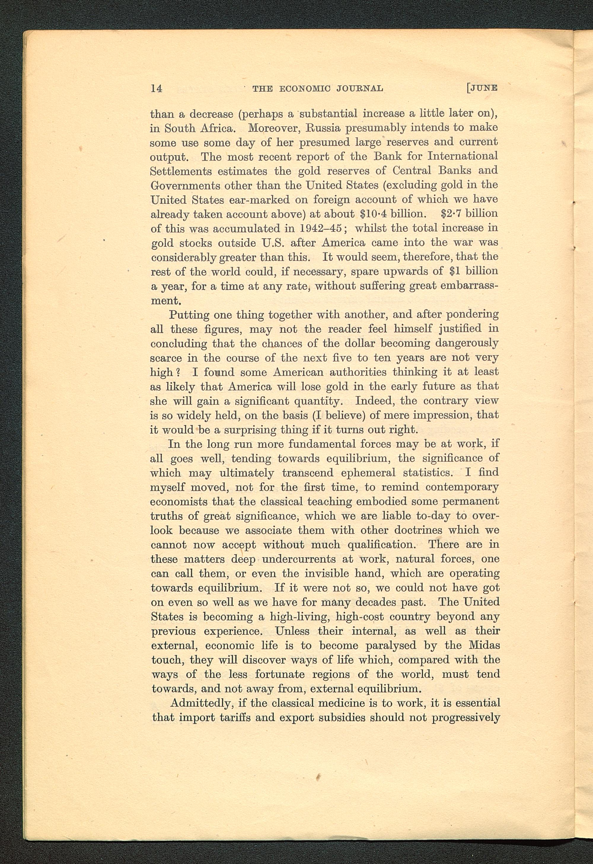 In the long run more fundamental forces may be at work, ifall goes well, tending towards equihbrium, the significance ofwhich may ultimately transcend ephemeral statistics. I findmyself moved, not for the first time, to remind contemporaryeconomists that the classical teaching embodied some permanenttruths of great significance, which we are liable to-day to over-look because we associate them with other doctrines which wecannot now accept without much qualification. There are inthese matters deep undercurrents at work, natural forces, onecan call them, or even the invisible hand, which are operatingtowards equihbrium. If it were not so, we could not have goton even so well as we have for many decades past. The UnitedStates is becoming a high-living, high-cost country beyond anyprevious experience. Unless their internal, as well as theirexternal, economic life is to become paralysed by the Midastouch, they will discover ways of fife which, compared with theways of the less fortunate regions of the world, must tendtowards, and not away from, external equilibrium.